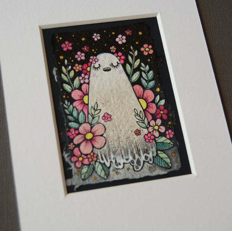 this aceo is an original artwork, hand drawn with a tiny 0.05 nibbed pen, then coloured with ink, artists pens and watercolour paints, on indian khadi paper. khadi paper is handmade from recycled cotton rag, it has a lovely textured surface and deckled edges. i have then mounted the illustration onto 300gsm cardstock, hand painted with a paynes grey to create a dark surrounding edge/background.