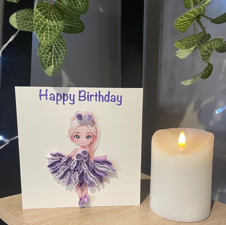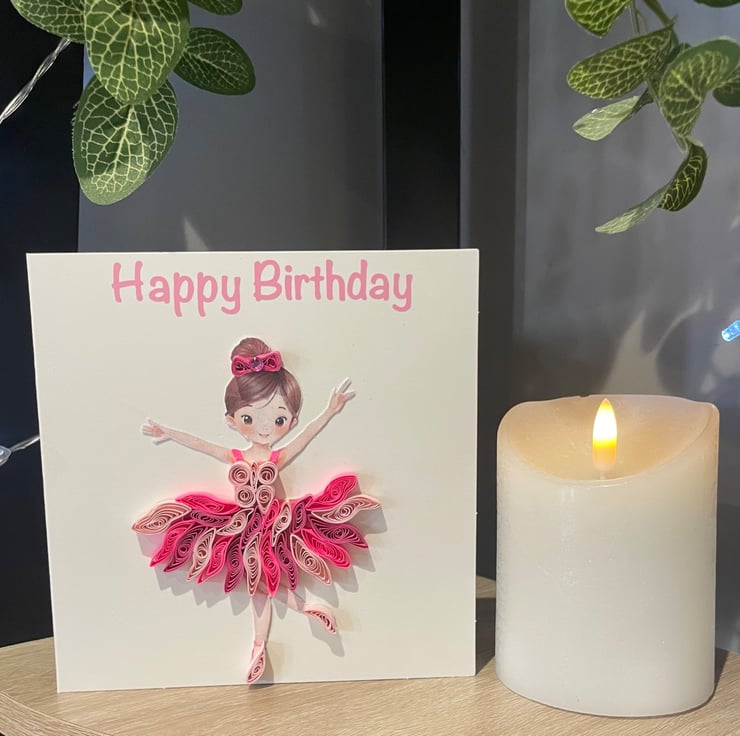 Beautifully hand crafted 15cm x 15cm card featuring an intricate quilled ballerina design.