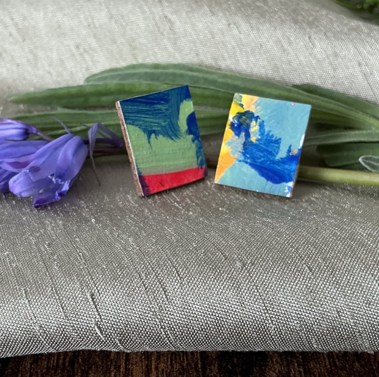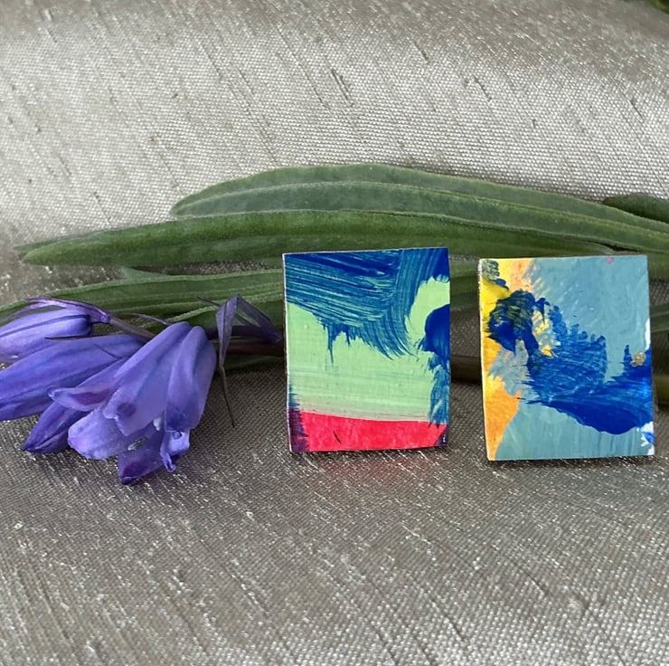 Handcrafted dramatic individual pieces of miniature abstract art, combined with its non identical twin, to make a unique pair of earrings. Posts are made from Stainless Steel.