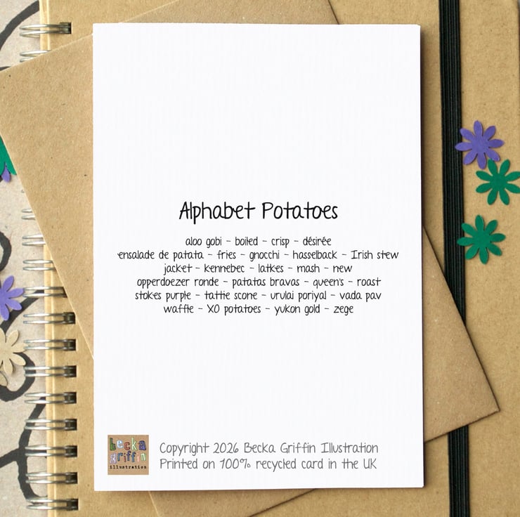 A beautiful greetings card featuring a potato - or related dish - for each letter of the alphabet.
