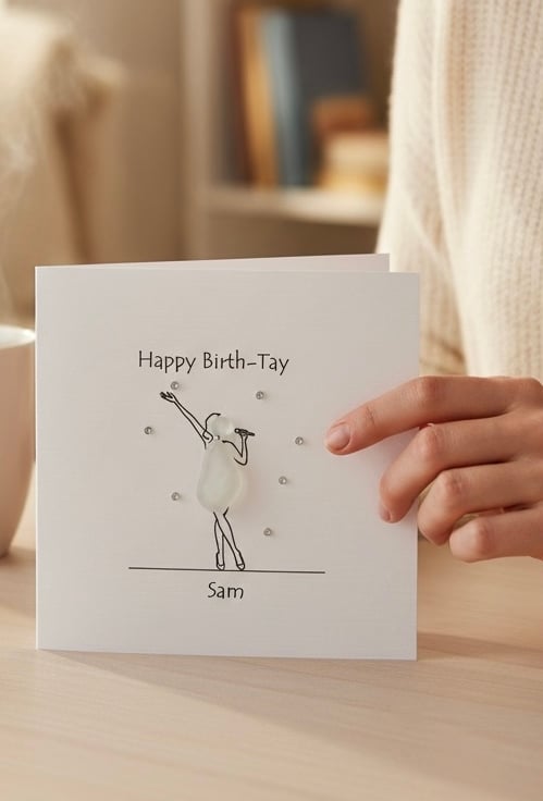 Celebrate a birthday in true Swiftie style with this unique, handcrafted sea glass card. Each piece is carefully designed using genuine sea glass, creating a one-of-a-kind silhouette inspired by the spirit of a devoted fan.