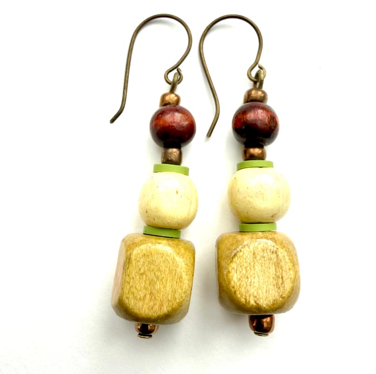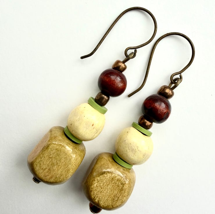 Light brown green cream and dark brown boho style dangle drop bead earrings handmade using up-cycled and shop brought beads.