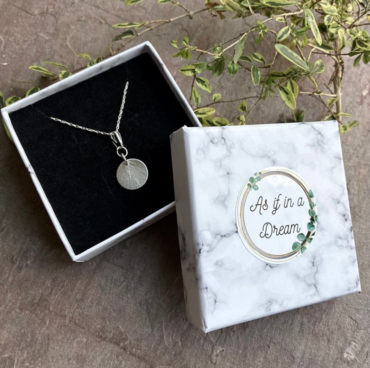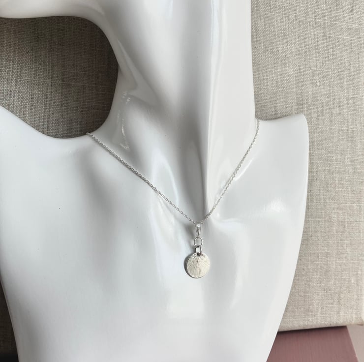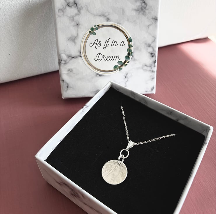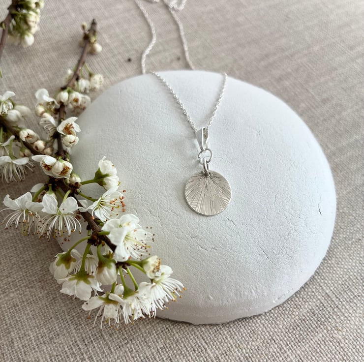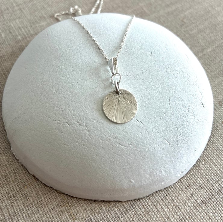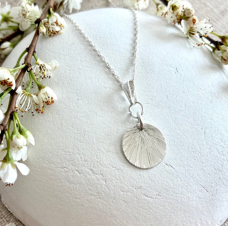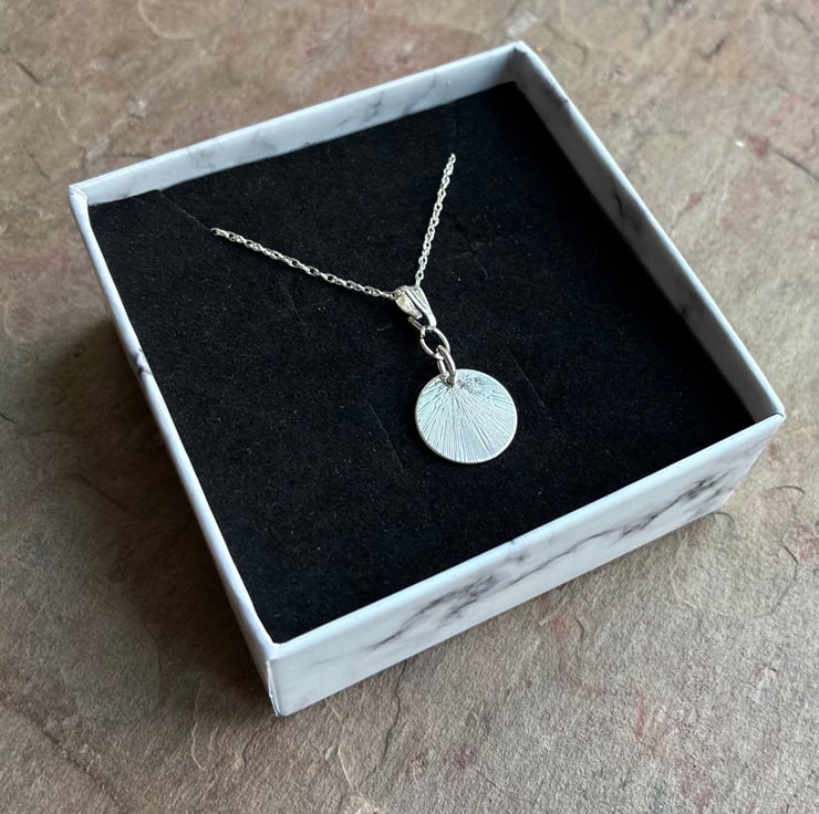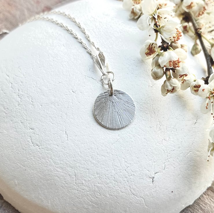 Beautifully minimalist, this pendant is smooth on one side while lightly etched with a sunburst pattern on the other. It measures 13mm in diameter and sits on a 16 inch (40cm) rope chain necklace with 1mm links and a spring ring clasp.