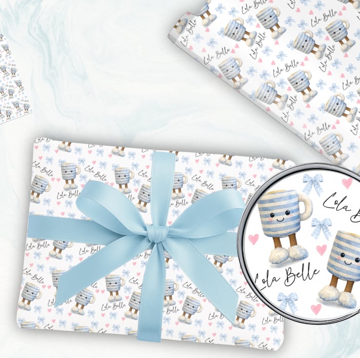 Add a touch of charm to your gifts with this adorable personalised wrapping paper featuring a sweet, smiling blue mug character! Designed with soft pastel tones, delicate bows, and tiny hearts, this wrapping paper is perfect for creating beautifully thoughtful presents.