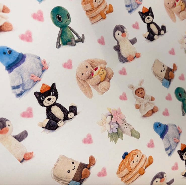 Add a charming finishing touch to your gifts with this personalised wrapping paper featuring adorable plushie characters. Designed in soft pastel tones, it creates a sweet and thoughtful presentation for any special occasion.