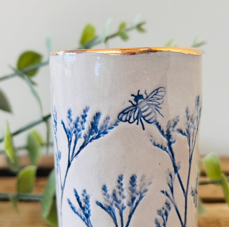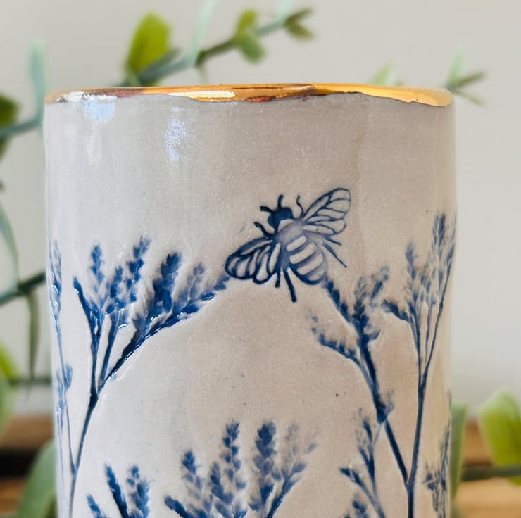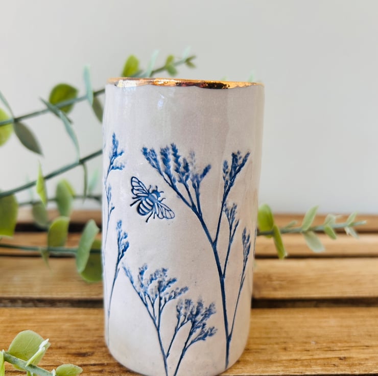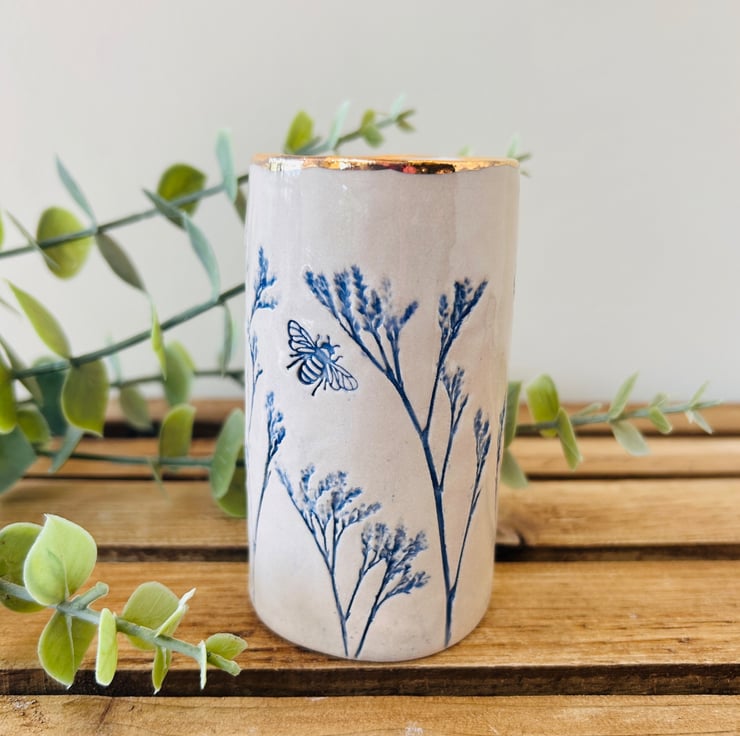 Each piece is individually pressed with real plants, allowing the clay to capture their delicate textures and intricate details. Because I use real plants in the making process, every vase is completely unique, no two will ever be the same. Some vases have the addition of a little bee pressed into them. Please refer to photos on each vase.