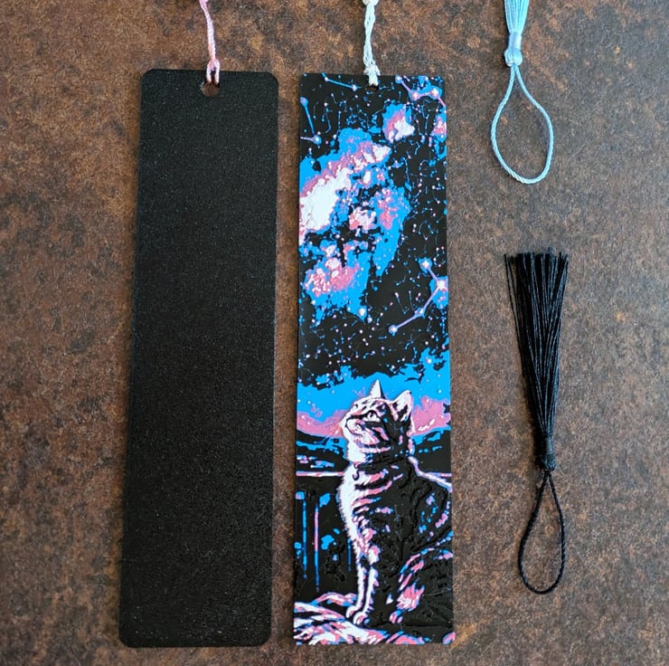This bookmark shows a thoughtful cat sitting under a starry night sky, with constellations dotted above.