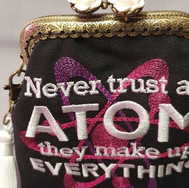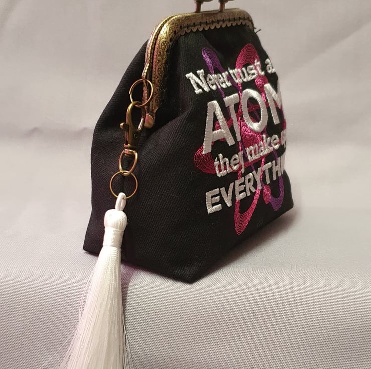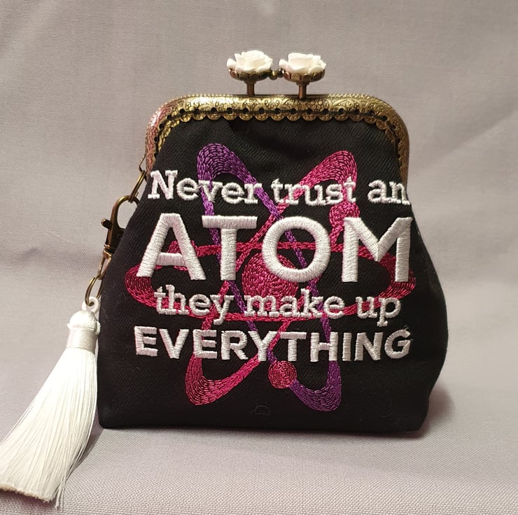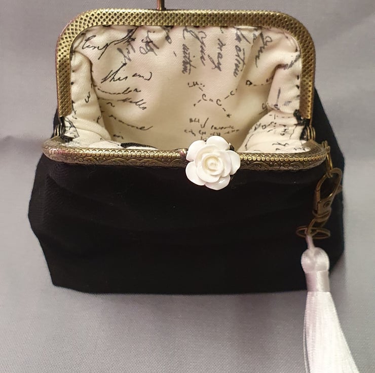 Metal frame is antique bronze colour with an unusual rose kiss lock clasp.