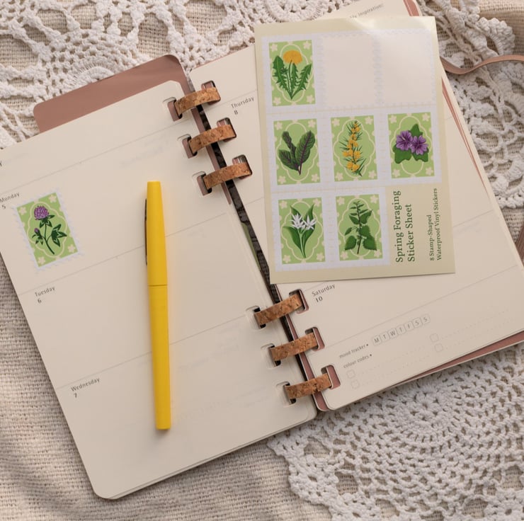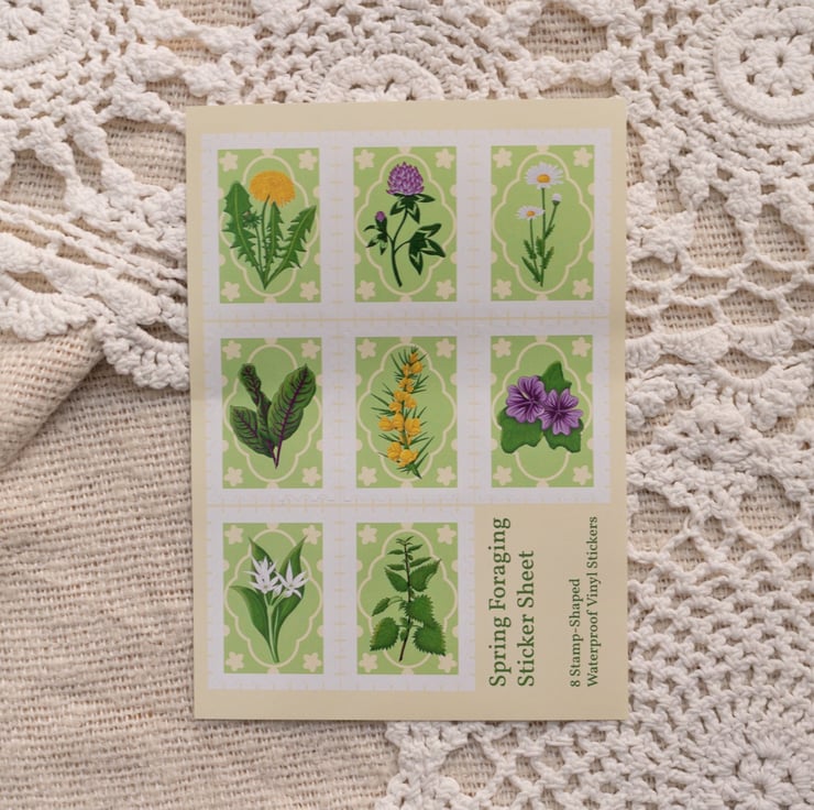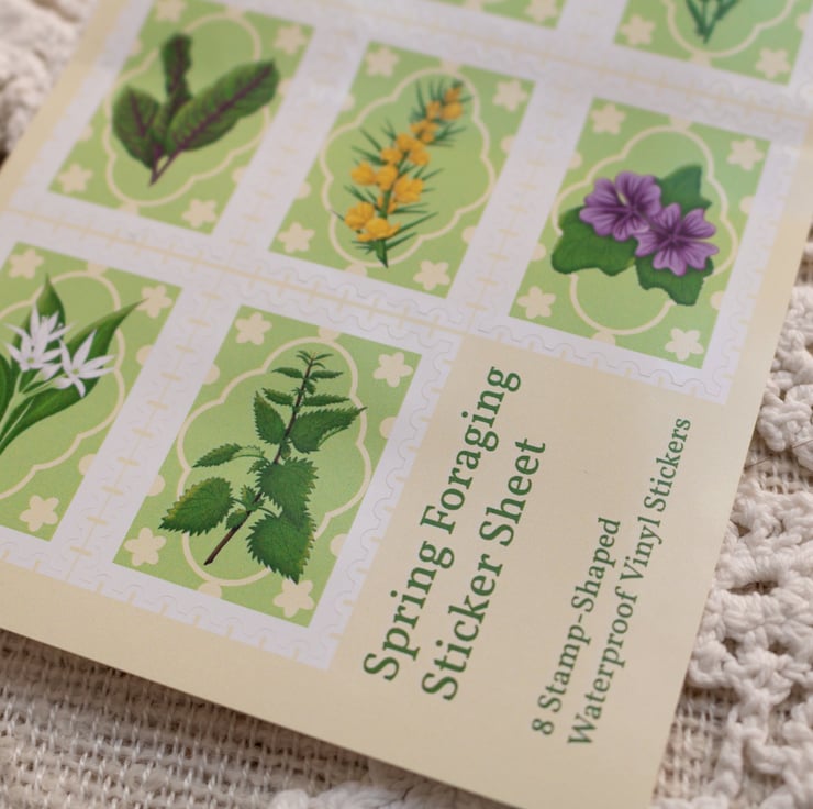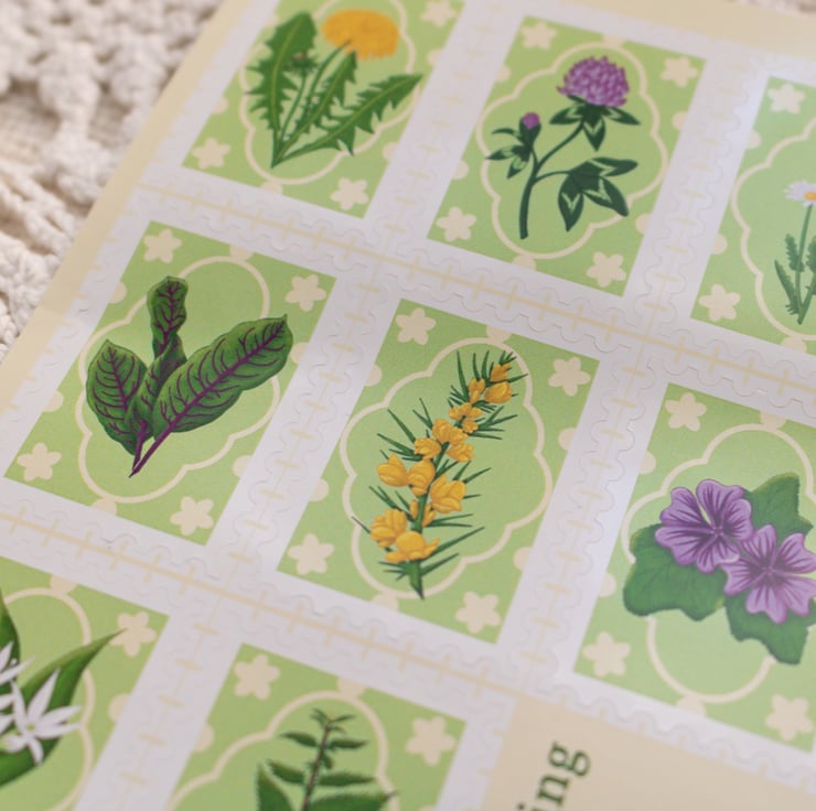 These 8 stamp-shaped stickers featuring native spring plants are the perfect way to decorate your (junk) journal. The plants are: dandelion, ox-eye daisy, clover, gorse, mallow, nettle, sorrel and wild garlic. All of these plants can be foraged in the UK.