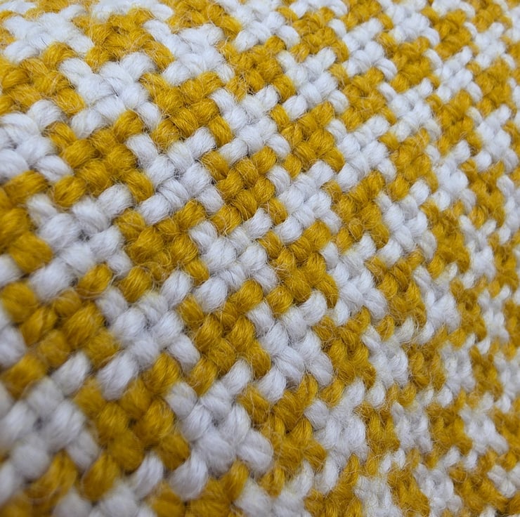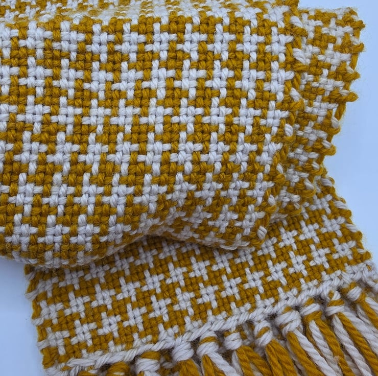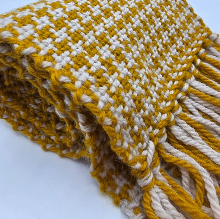 A lovely dog tooth woven scarf, pure wool Mustard and cream yarn Alaska from Drops.