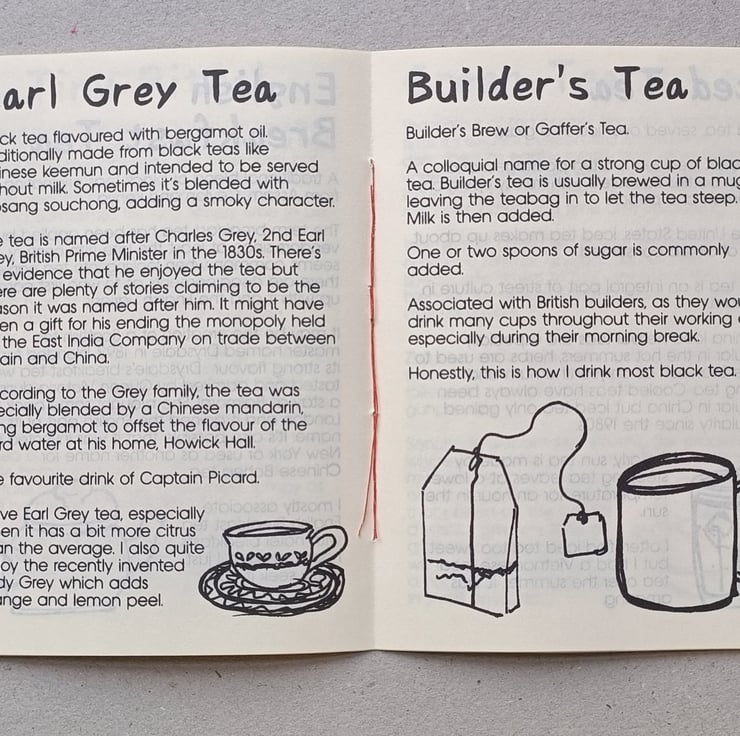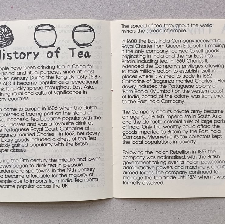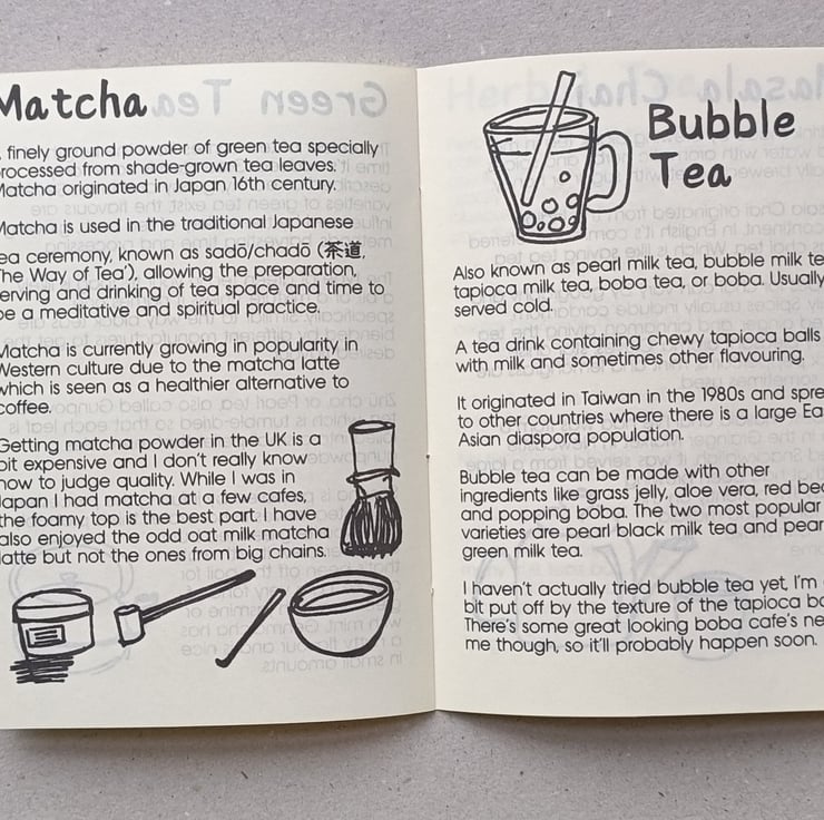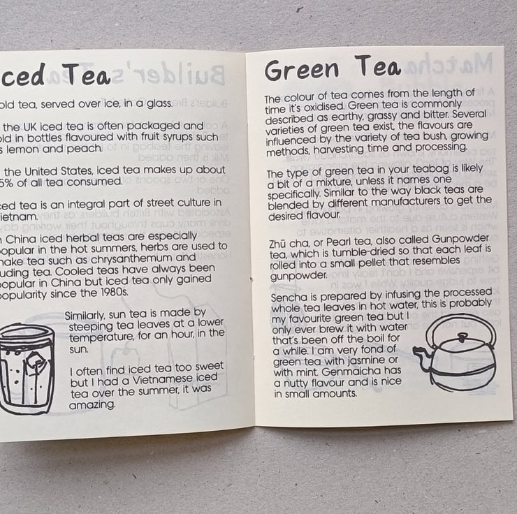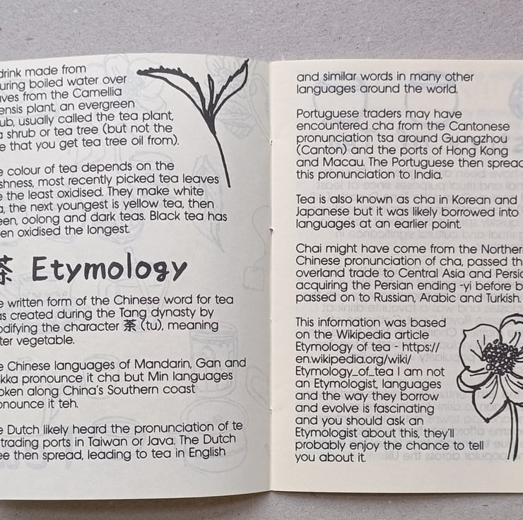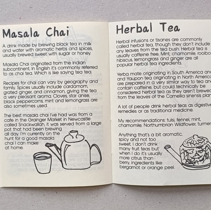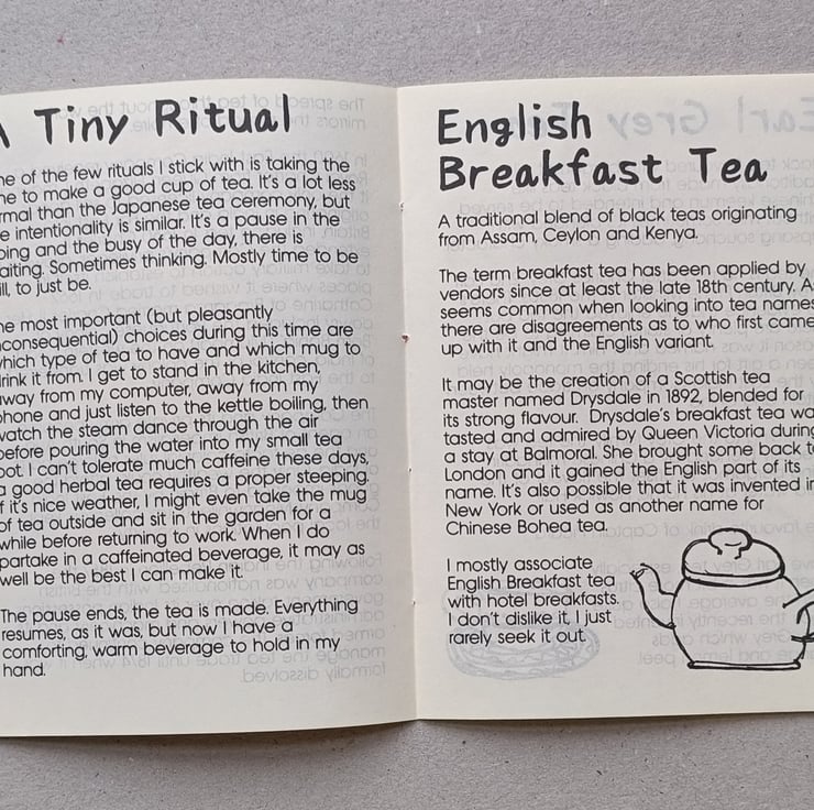 A zine all about tea, something I drink very regularly and knew a bit about but got deep into a research rabbit hole on.