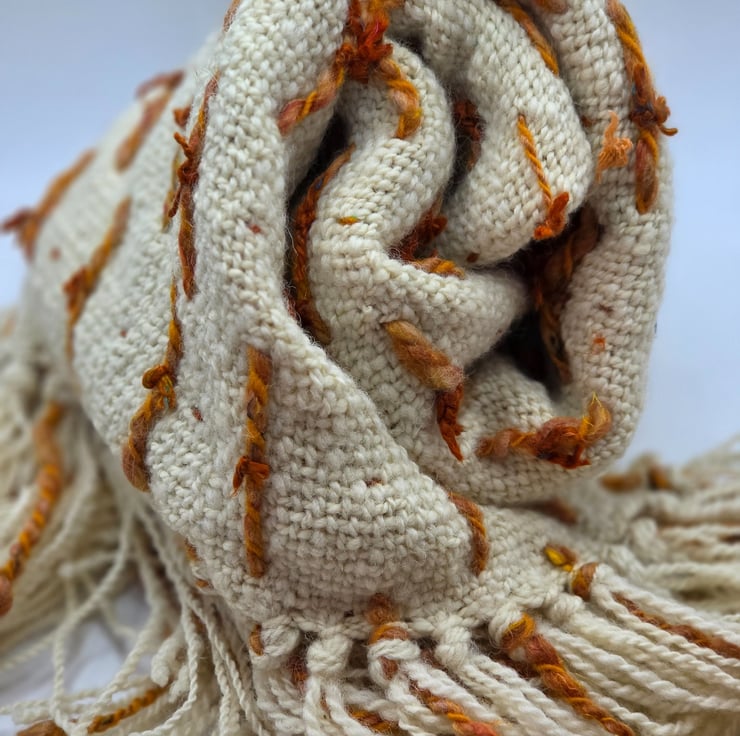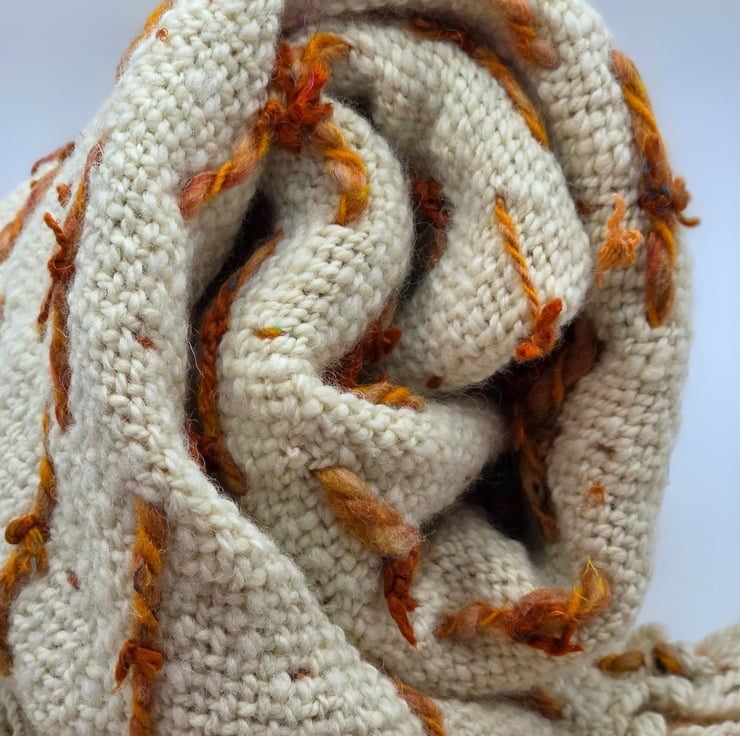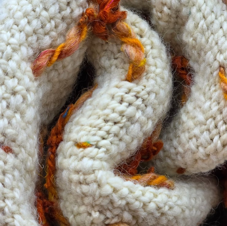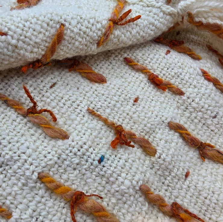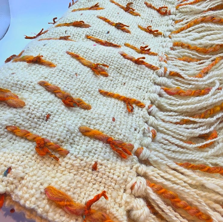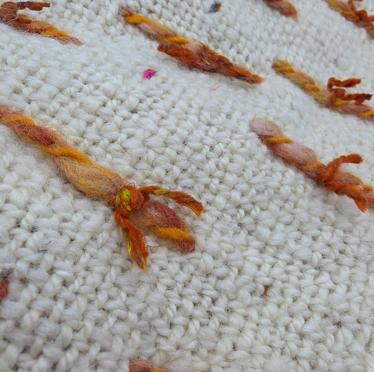 Hand woven Romney wool is the main body with loops of merino & Corriedale and then finished with the loops hand tied with sari silk.