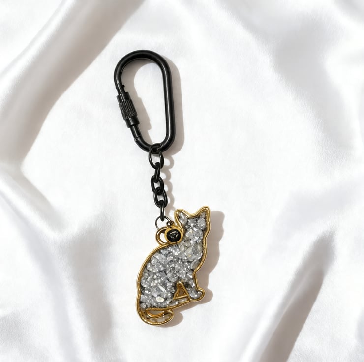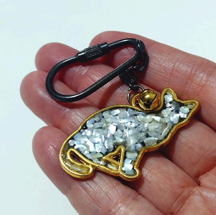 This handmade key chain features a shell and resin cat pendant, with one side in glossy black and the other in soft pearly white. The contrast gives it a quiet elegance, and the gold outline adds a warm, refined finish.