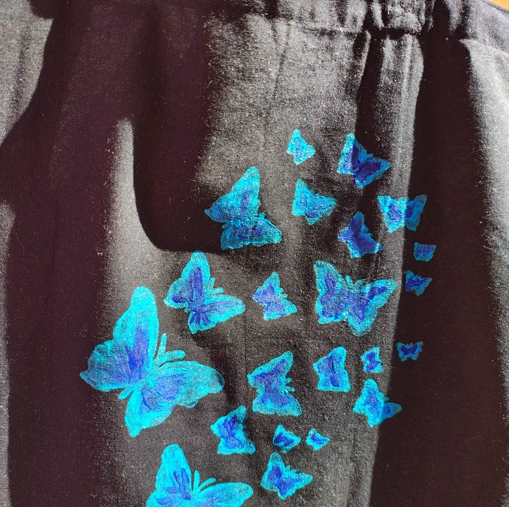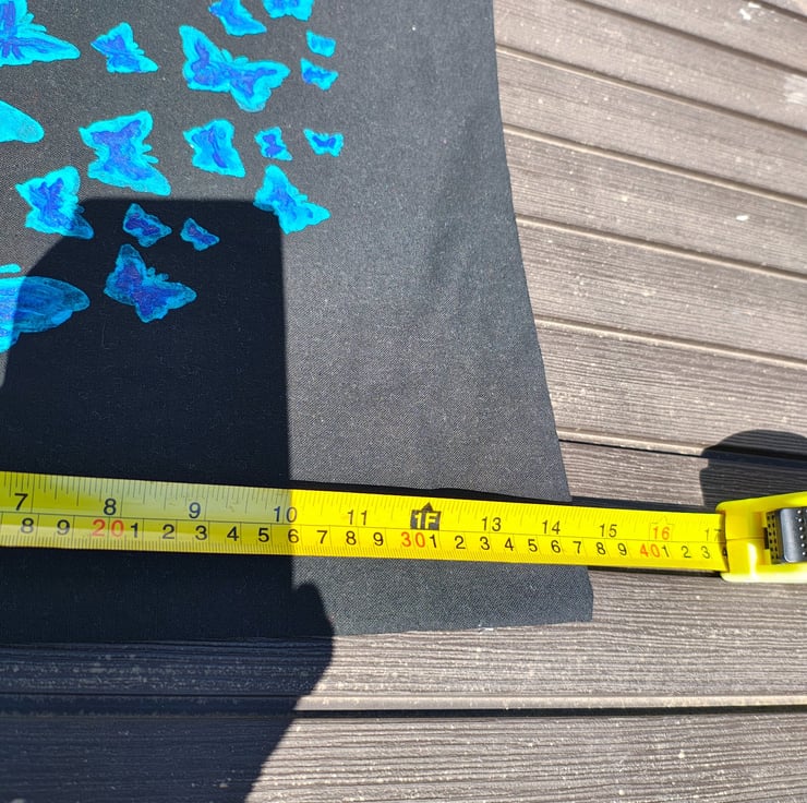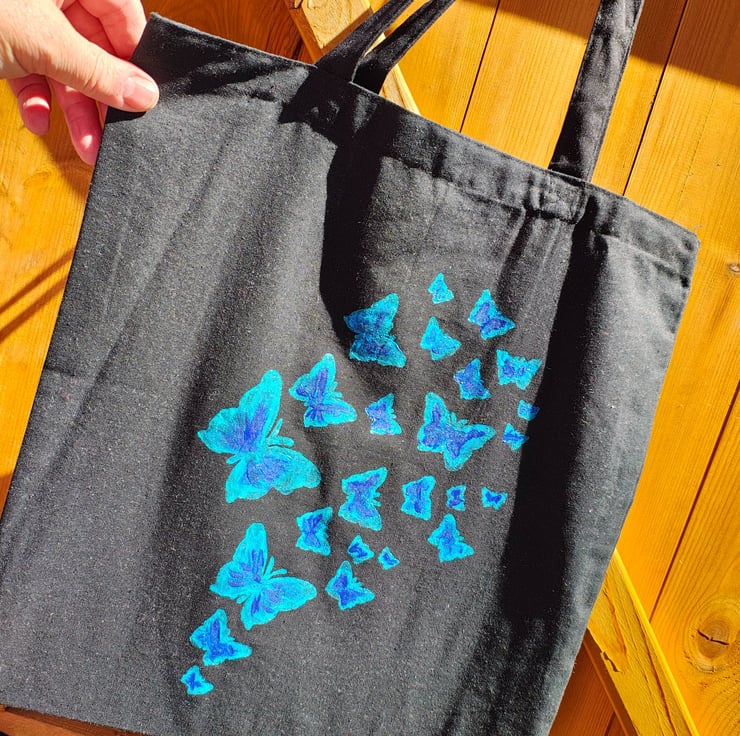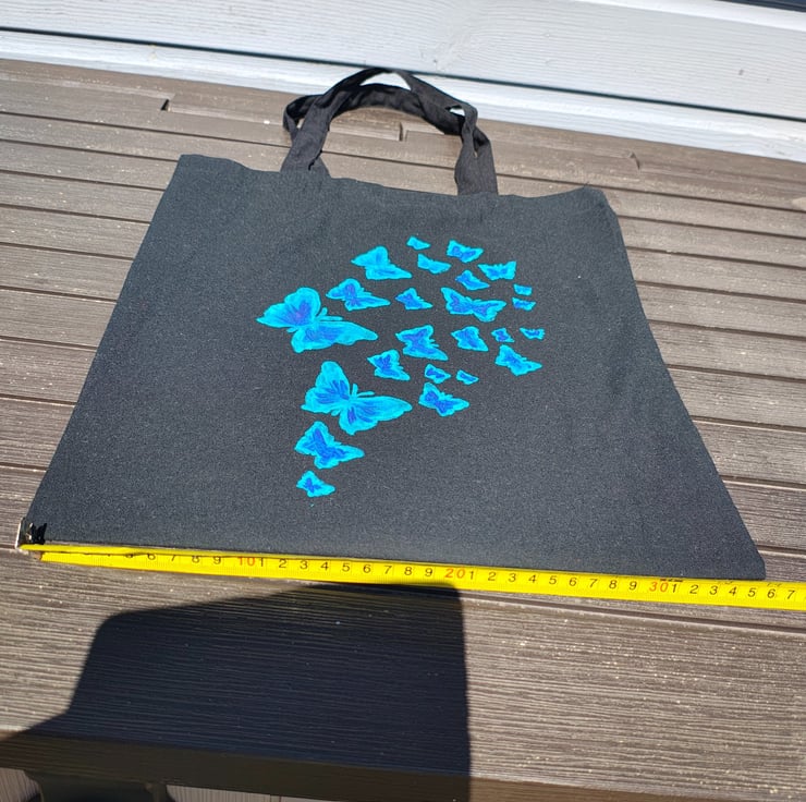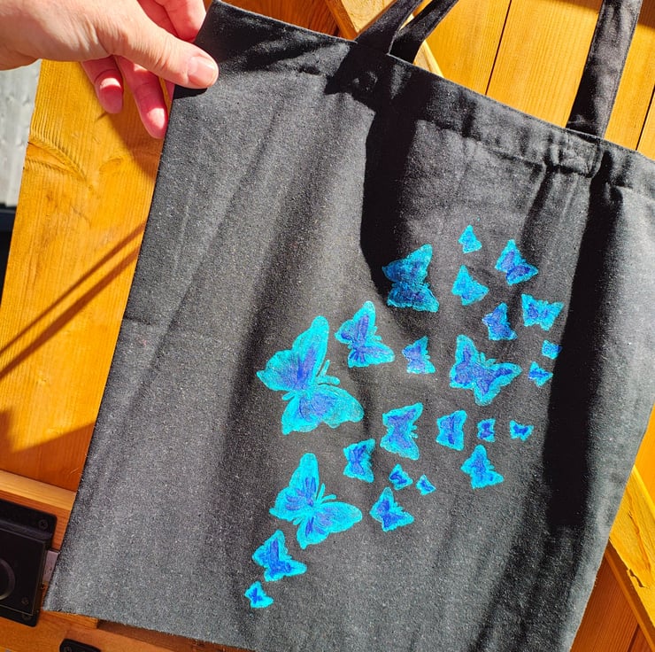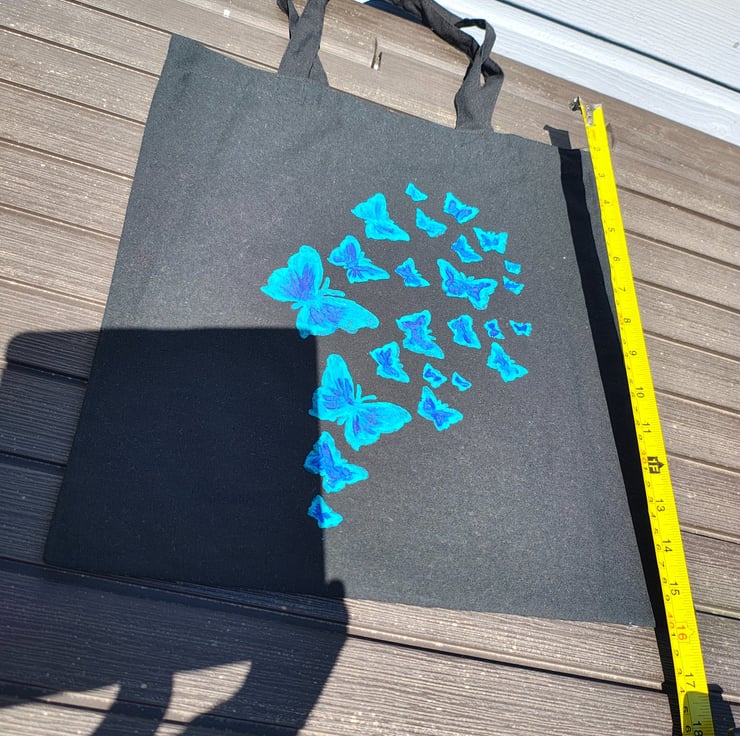 Cotton tote bag with a great hand painted design on the front. The bag is so versatile as you could use it to carry your shopping, as a gift or gift bag, for your kids to use it for when they go swimming.