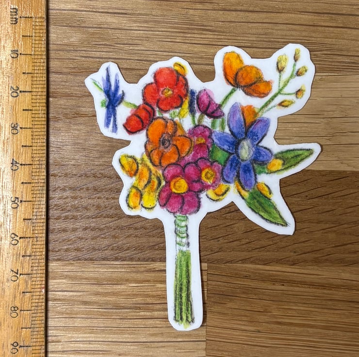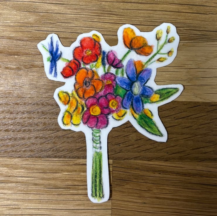 This gorgeous colourful sticker features a drawing of a bunch of flowers, taken from an original illustration in watercolour pencil. It measures approximately 7.5cm x 6.5cm at the widest points.