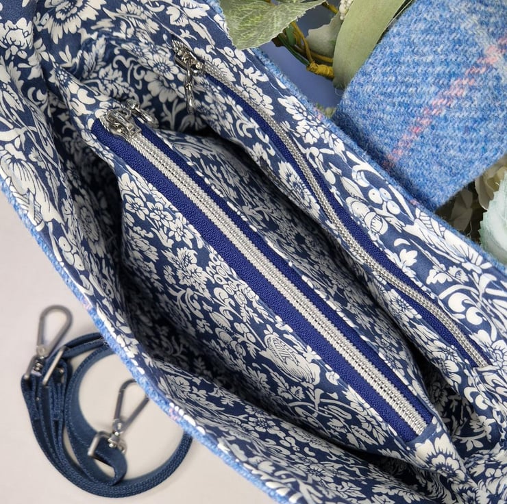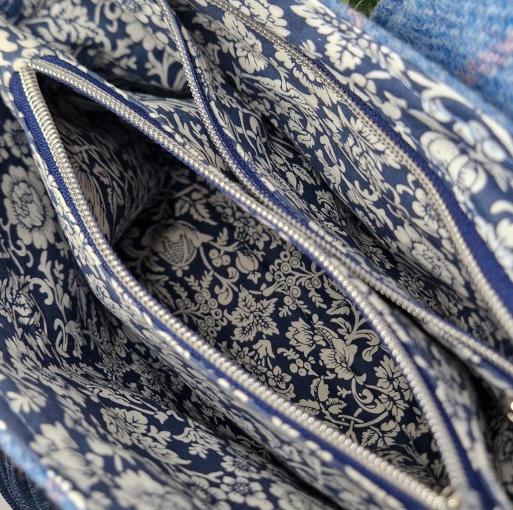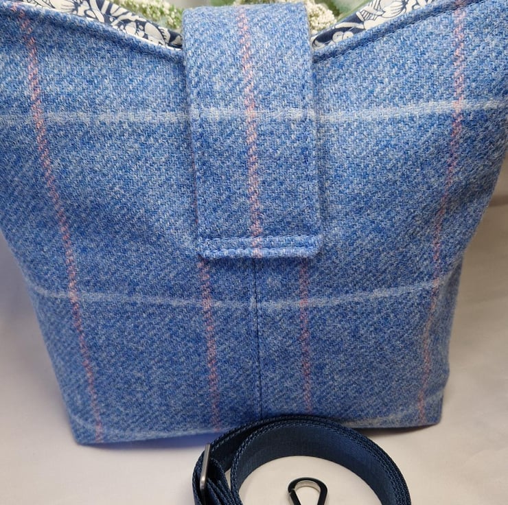 Beautiful Bucket Bag in Abraham Moon blue Yorkshire window pane check tweed. The interior is lined with a gorgeous coordinated cotton lining and houses a built-in zipped pouch to keep your essentials safe and secure. It also has a zipped interior pocket and the exterior fastens with a magnetic clasp.