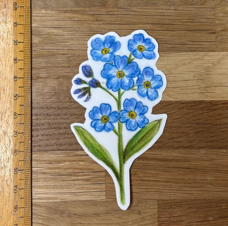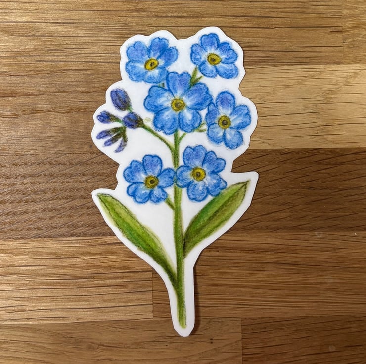 This gorgeous colourful sticker features a drawing of a bunch of forget-me-nots, taken from an original illustration in watercolour pencil. It measures approximately 9.5cm x 5.5cm at the widest points.