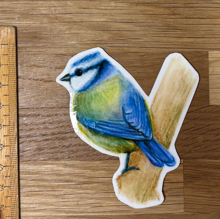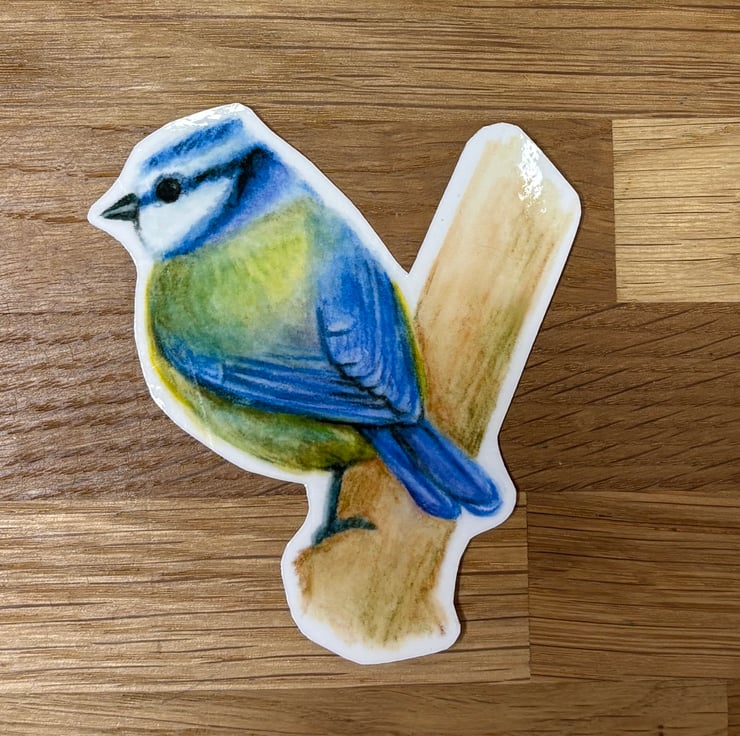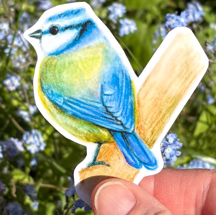 This gorgeous sticker features a drawing a blue tit, taken from an original illustration in watercolour pencil. It measures approximately 8.5cm x 7cm at the widest points.
