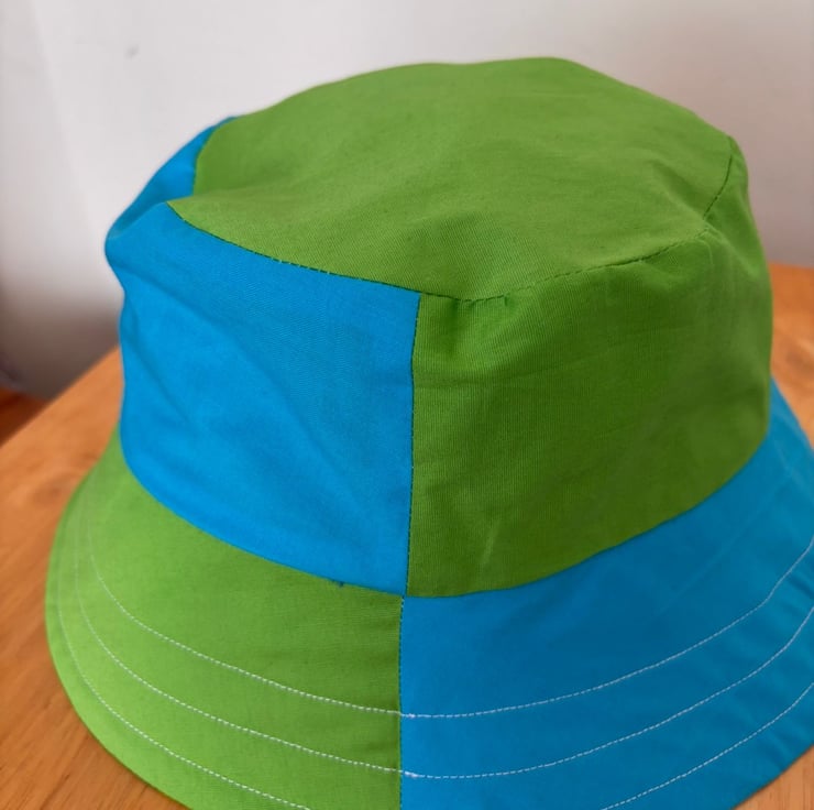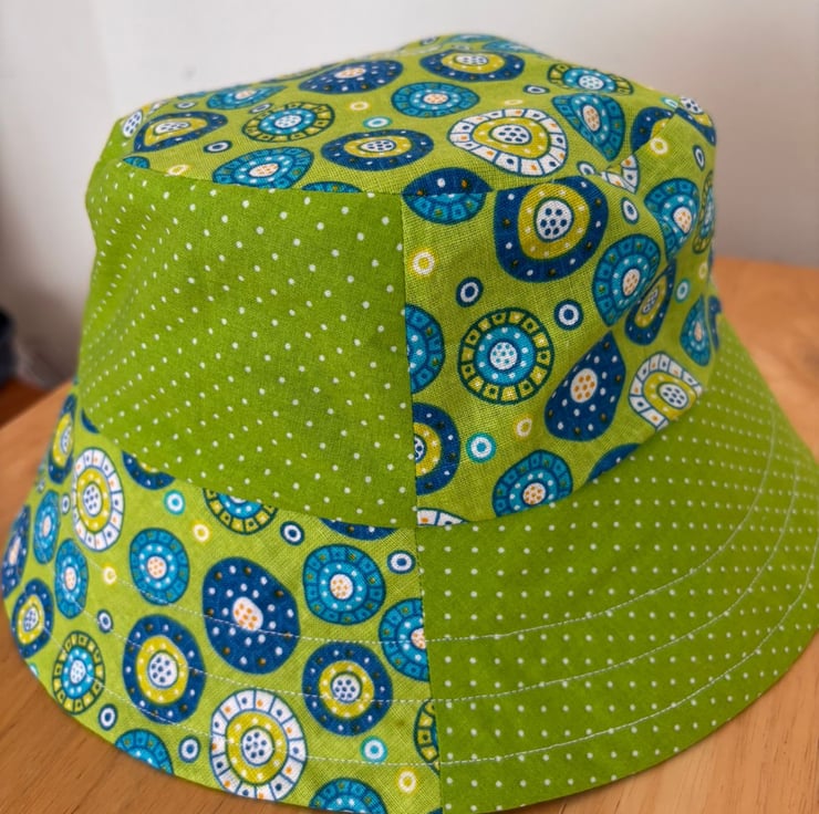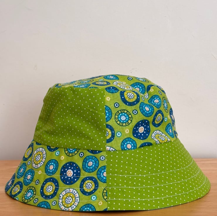 A fresh take on a summer essential, this reversible patchwork bucket hat blends playful design with everyday versatility. Crafted from lightweight cotton, one side features a vibrant mix of blue and green prints, where cheerful polka dots echo the circular motifs for a cohesive, eye-catching look. Flip it inside out for a more understated style, revealing a clean, plain blue and green fabric that pairs effortlessly with any outfit.