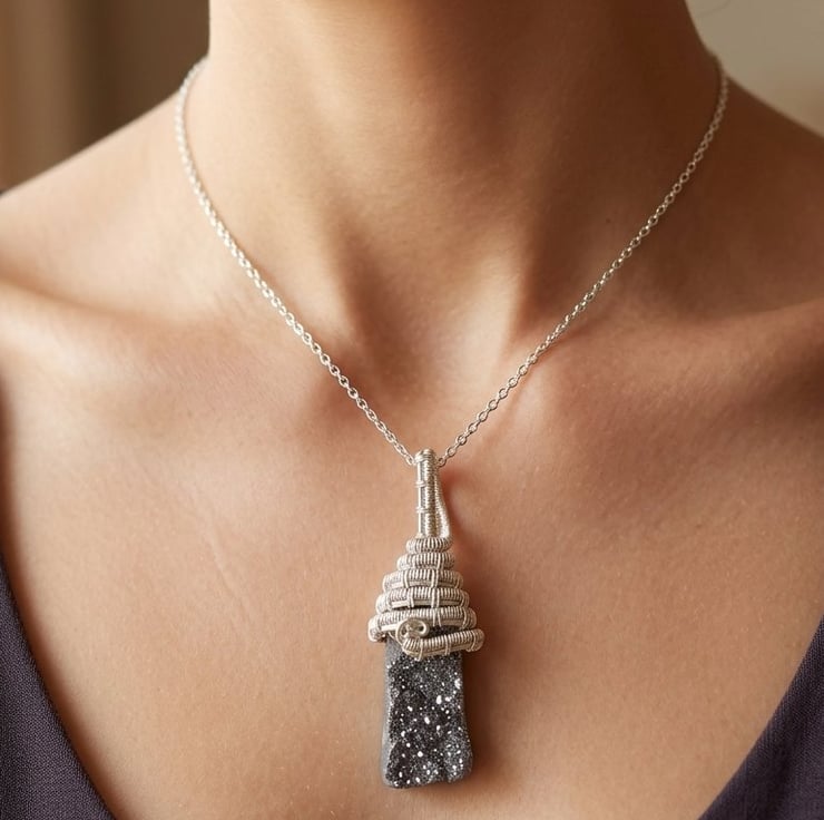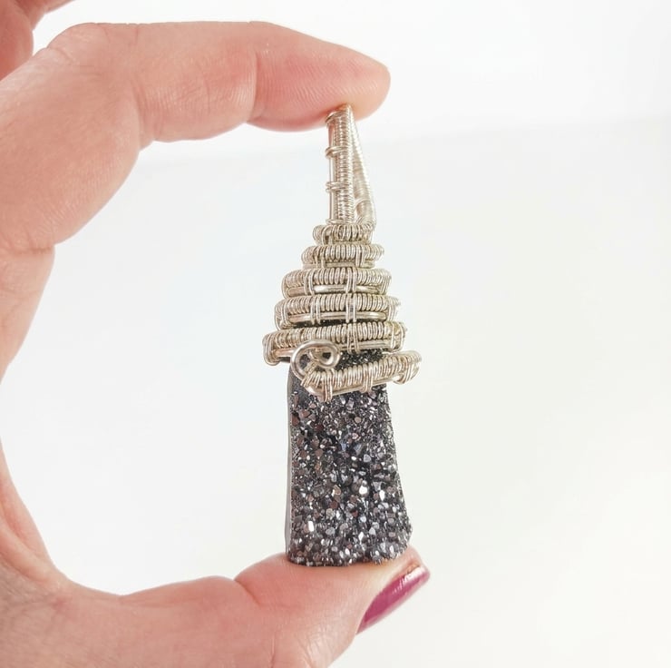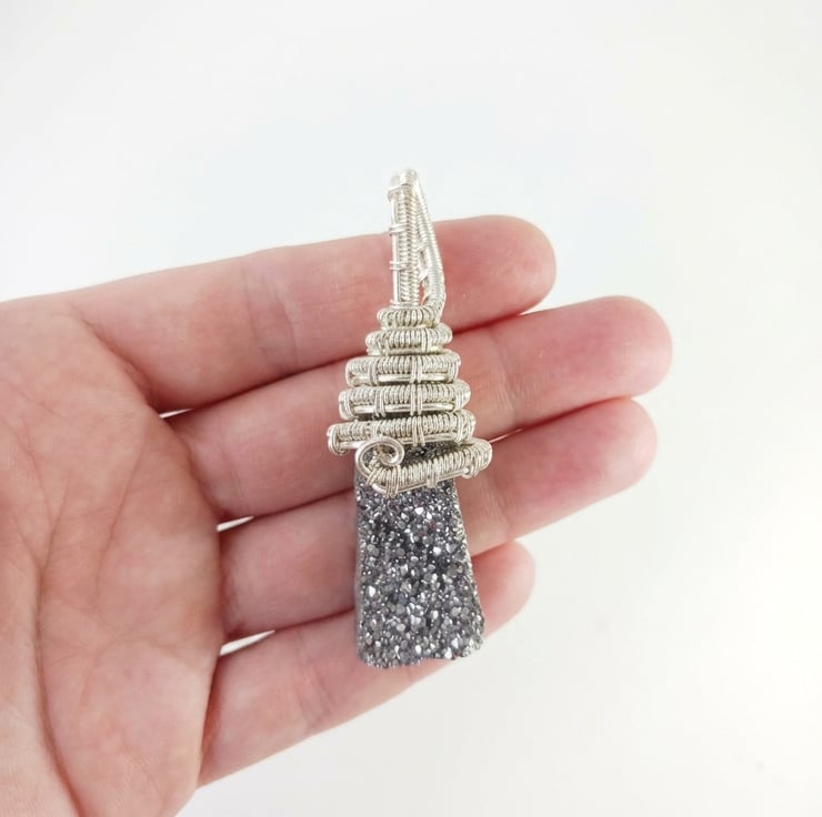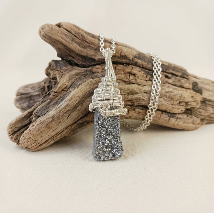 A beautiful wire work druzy pendant, it comes on a 20" trace chain, and measures approximately 3" by 0.9".