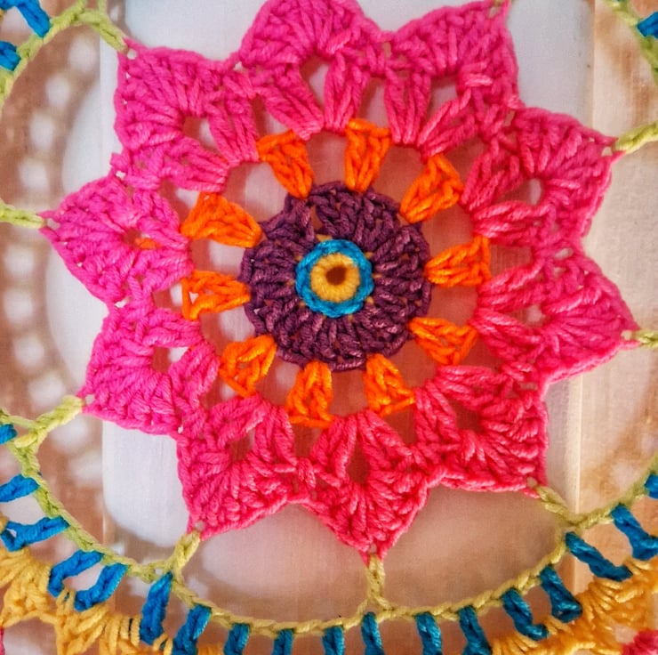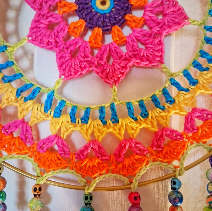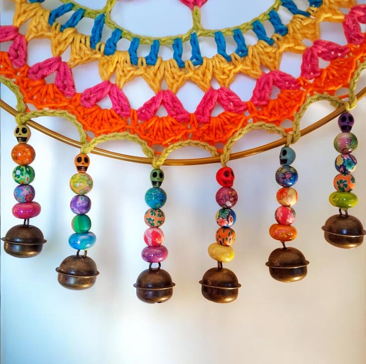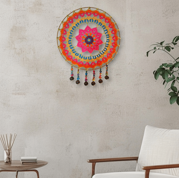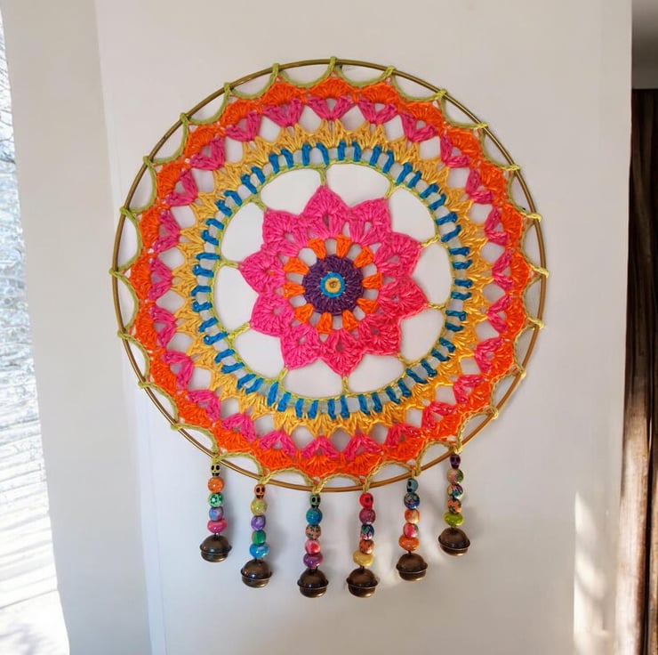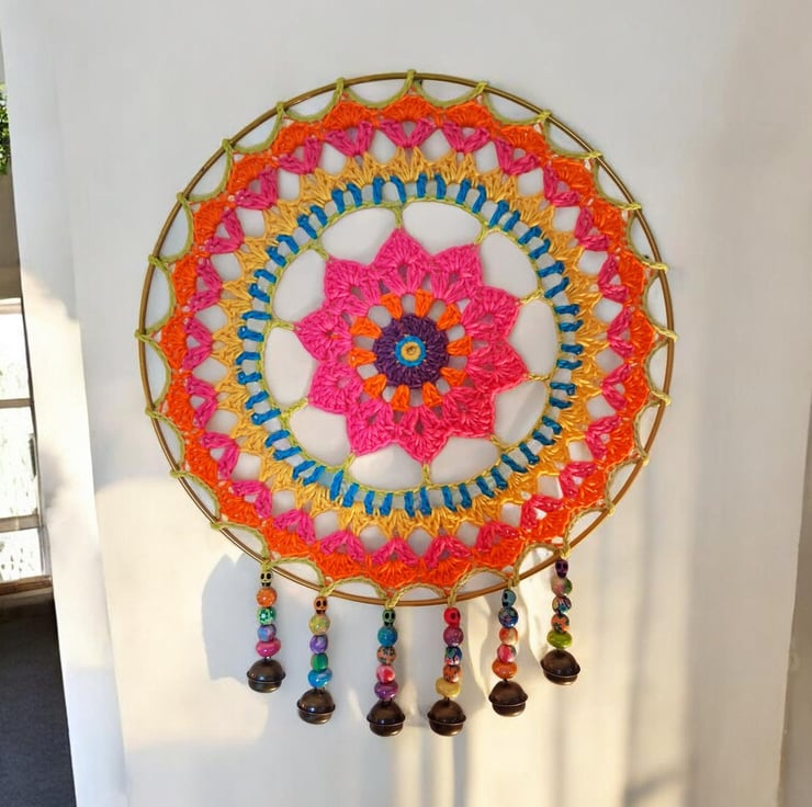 Add some colour to your room with this beautiful mandala dreamcatcher with added beads and bells. 30 cm diameter.