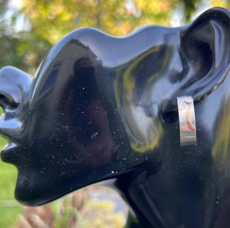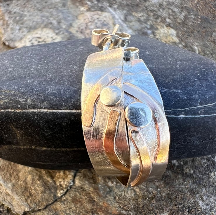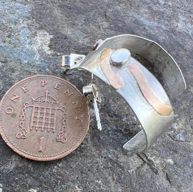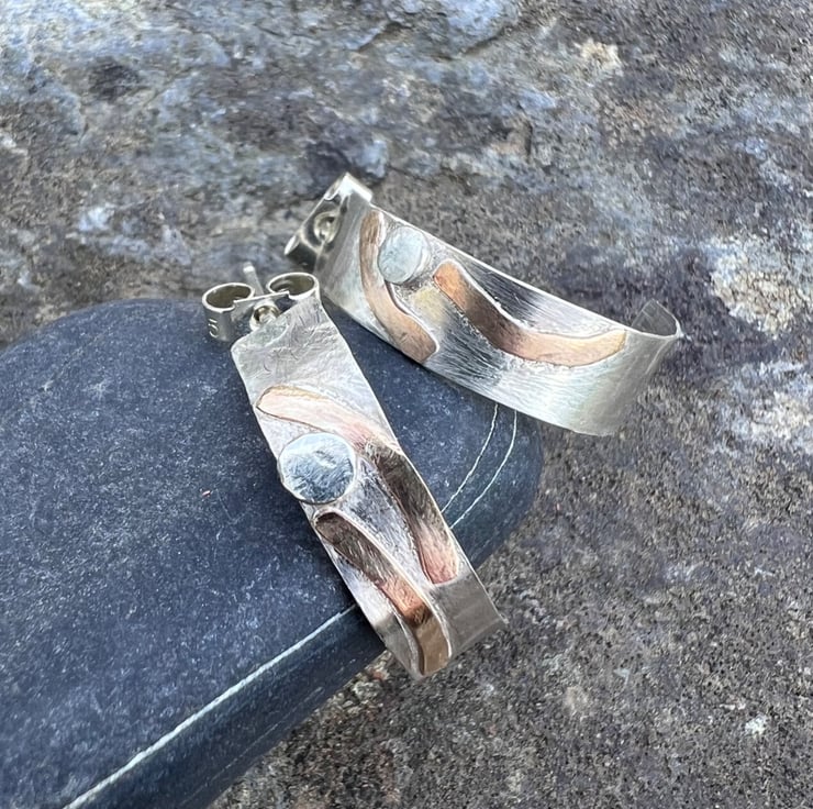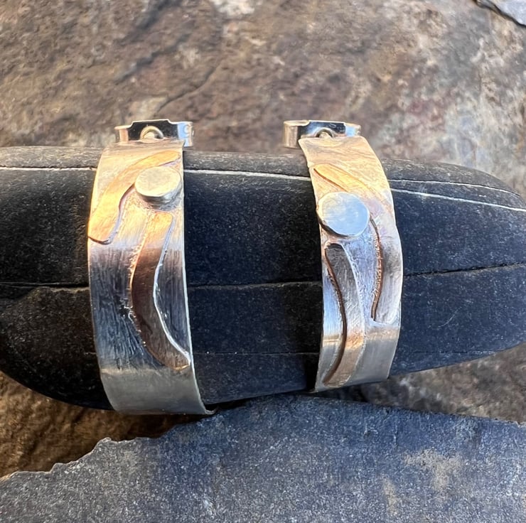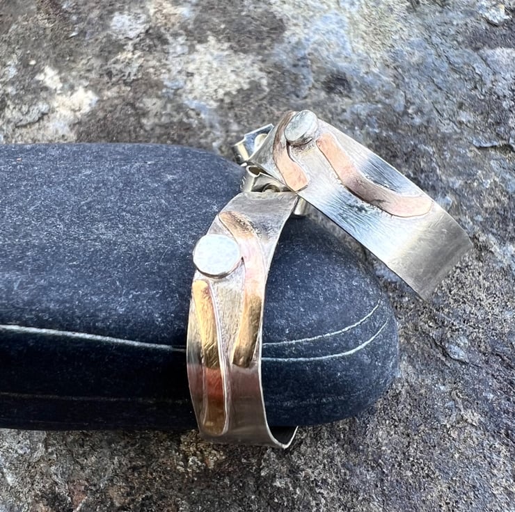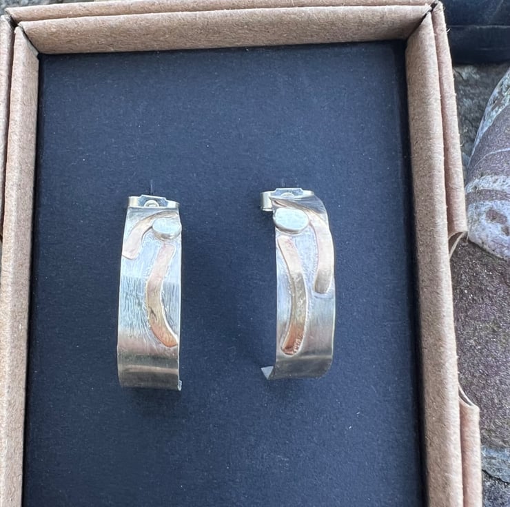 Silver hoop earrings with a textured strip of gold filled wire, inspired by stripy rock formations on the coast . They are fastened onto the ear with sterling silver ear posts and scroll backs.