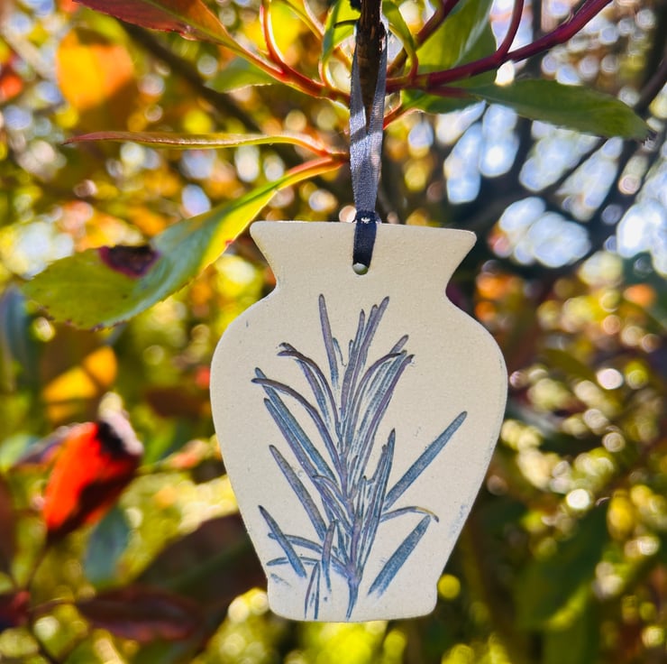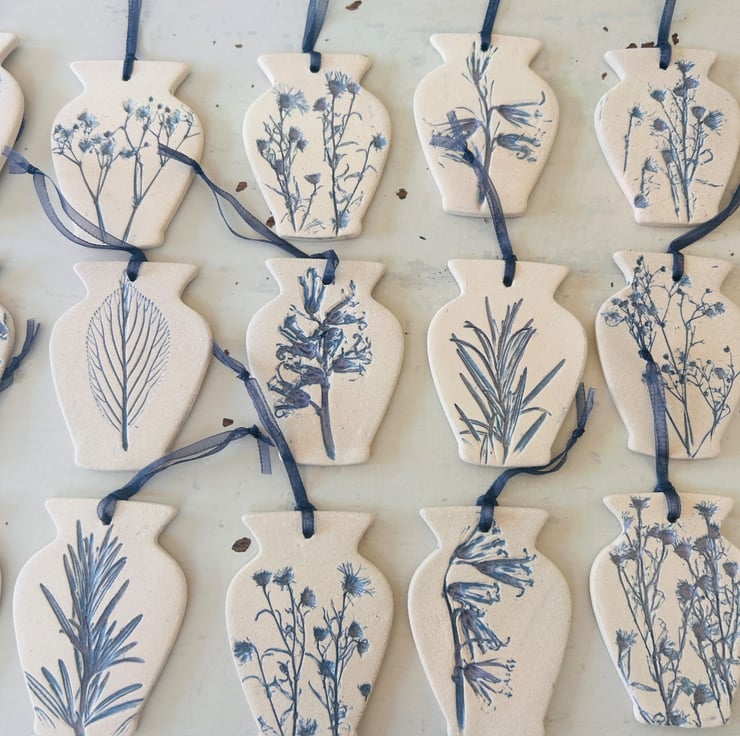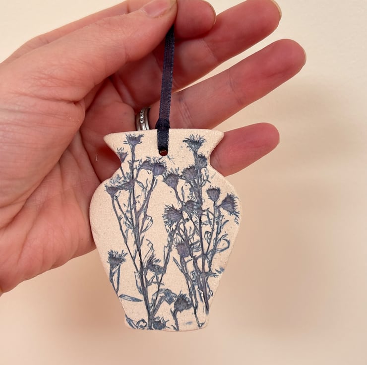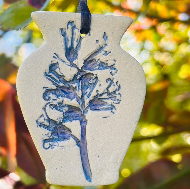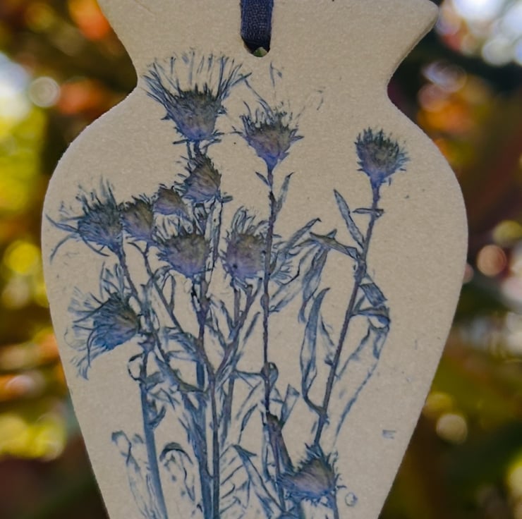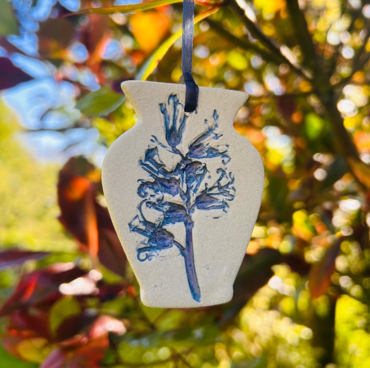 A little vase shaped hanging decoration impressed with real plants. By using real plants it makes each little hanging decoration totally unique. These are high fired but left unglazed in order to capture all intricate botanical detail. Due to the nature of the blue glaze used so may have hint of purple in them.