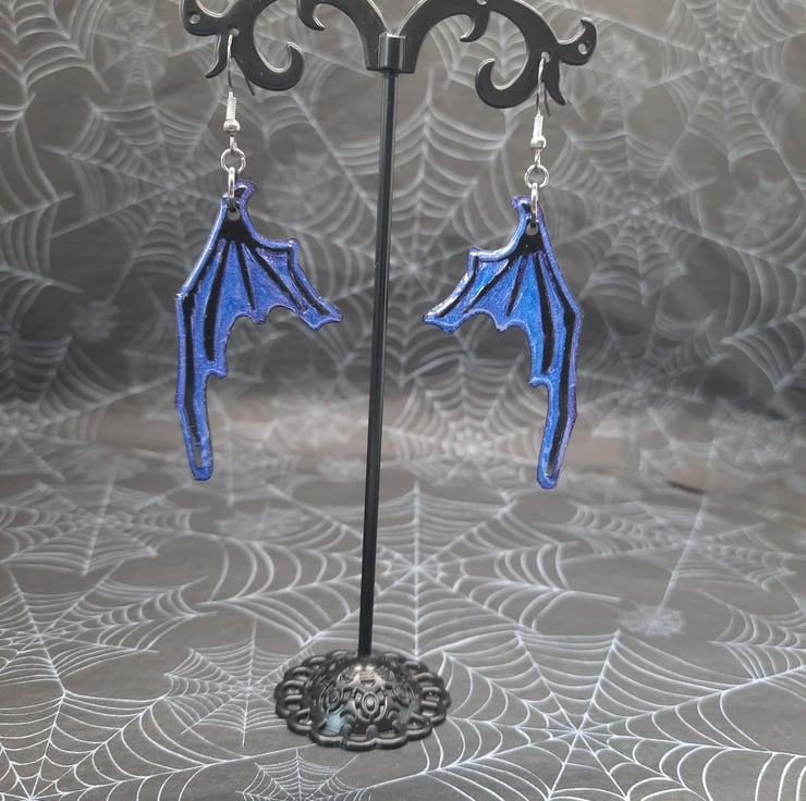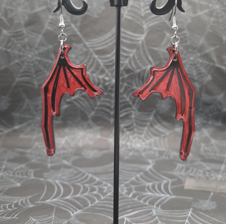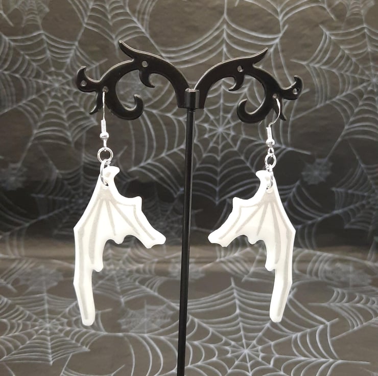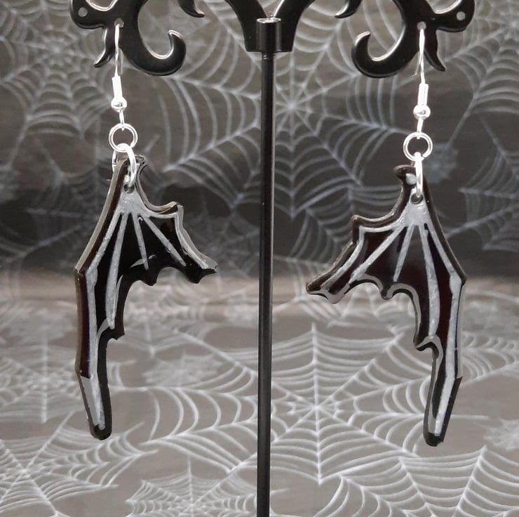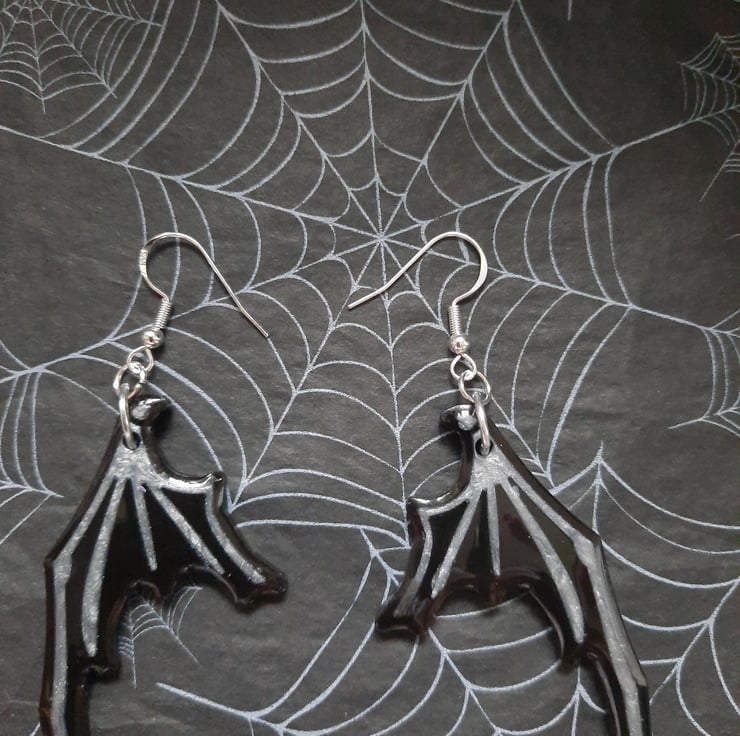 These medium sized handmade resin wing earrings are giving slightly skeletal vibes. I imagine them to belong to a gnarly old dragon or some slender pit demon nightmare fuel. The wings are much more angular and than others in this Collection and have much more of a creepy feel to them.