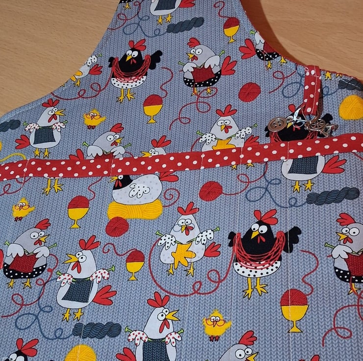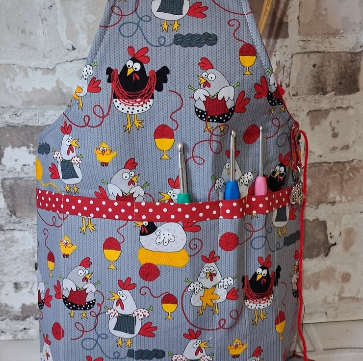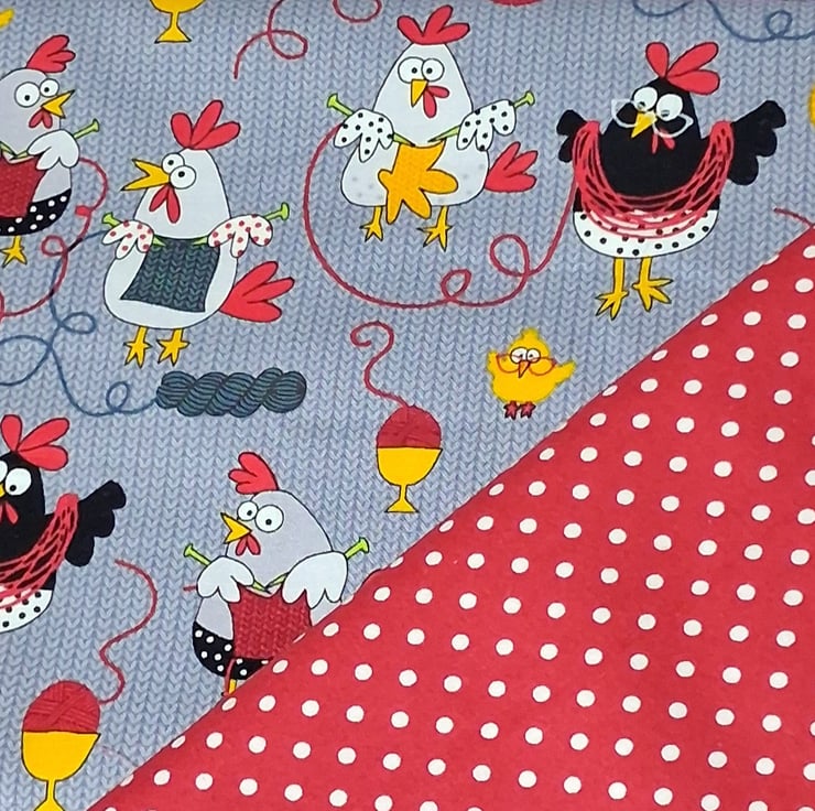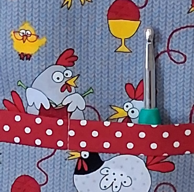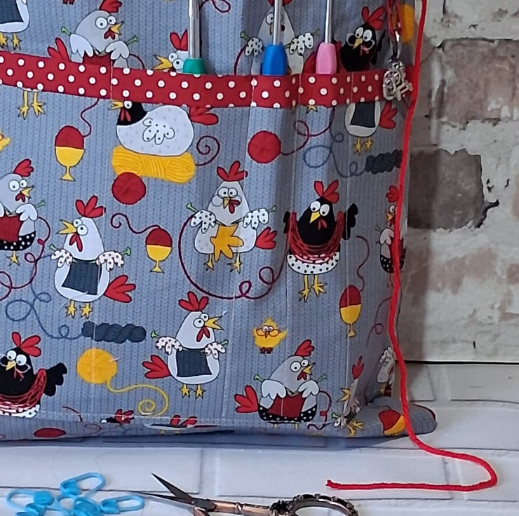 This is a very cute knitting/crochet project bag. It's 100% cotton with a knitting chicken themed fabric outside and a red and white spot lining. The bag is fully lined and has pockets, both inside and out, perfect for hooks, scissors etc. It slips over your arm while you are knitting/croceting keeping your wool inside the bag instead of unravelling or rolling away from you. I have added a loop on the front and added a couple of wool markers. (Hooks and wool is not included)