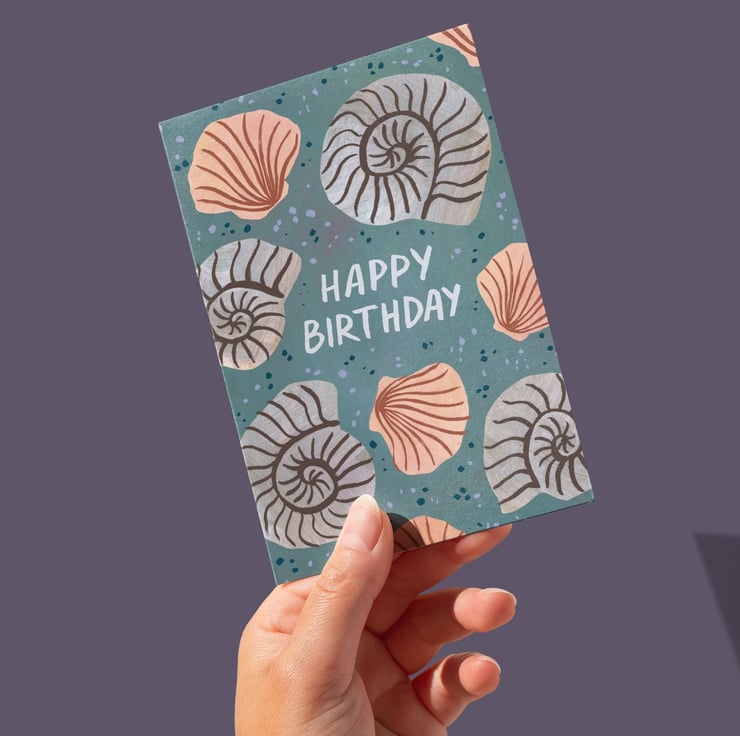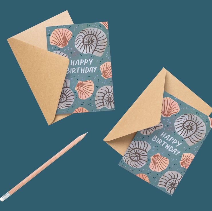 A fun and unique birthday card illustrated by Hayley Wells. This seaside-themed card features fossils of shells and ammonites on a watery background. Perfect for beach combers, surfers and mermaids, whether they're friends, siblings, partners or other relatives.