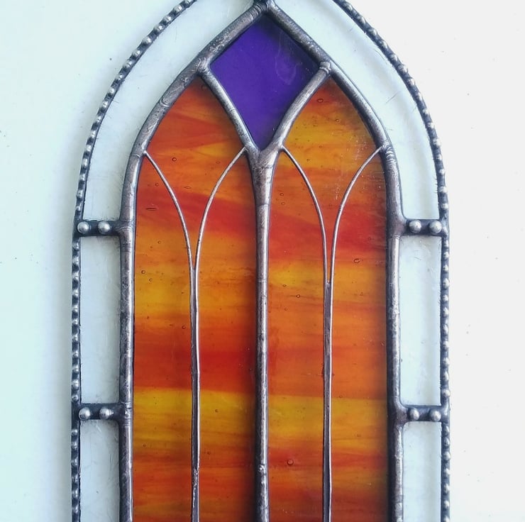 Stained glass cathedral arch handcrafted from glorious sunset red and gold wispy glass with a frosted 'gluechip' border. Finished with decorative solderwork edge and traditional pewter solder. Ideal to add quiet calm to a spiritual corner or memory garden.