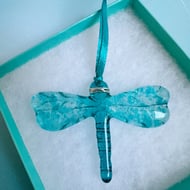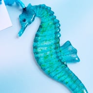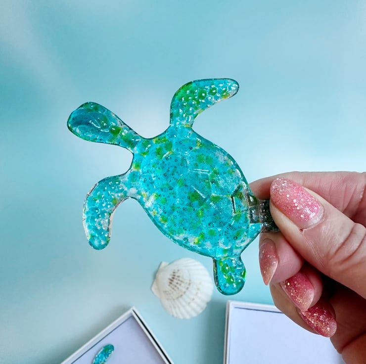 A cute little decorative sea turtle in various shades of peacock, green, blues and transparent.