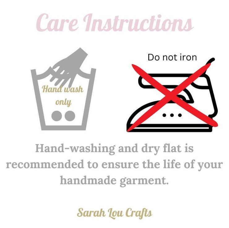 Hand wash only and dry flat, do not iron to ensure the life of your handmade garment by Sarah Lou Crafts.