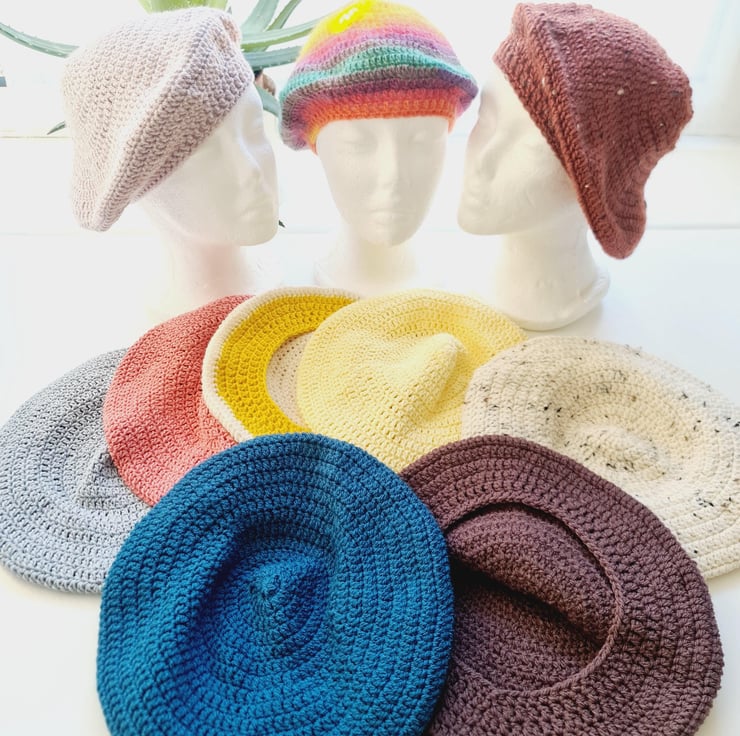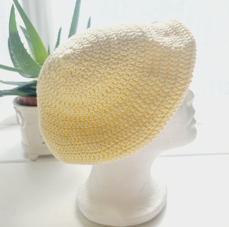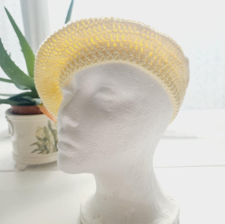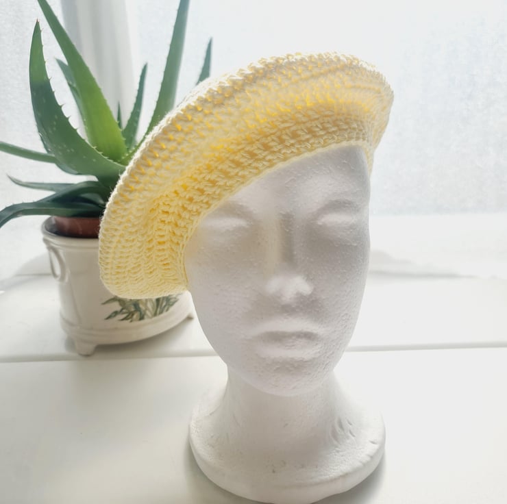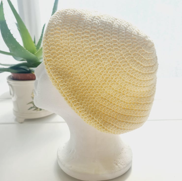 Brighten up any outfit with this stunning, handcrafted beret hat. Crocheted with eco-friendly, recycled cotton yarn in a pretty pastel yellow, this beret is as kind to the planet as it is stylish. Its classic design offers a comfortable and snug fit, making it the perfect accessory for adding a touch of unique charm and colour to your wardrobe.