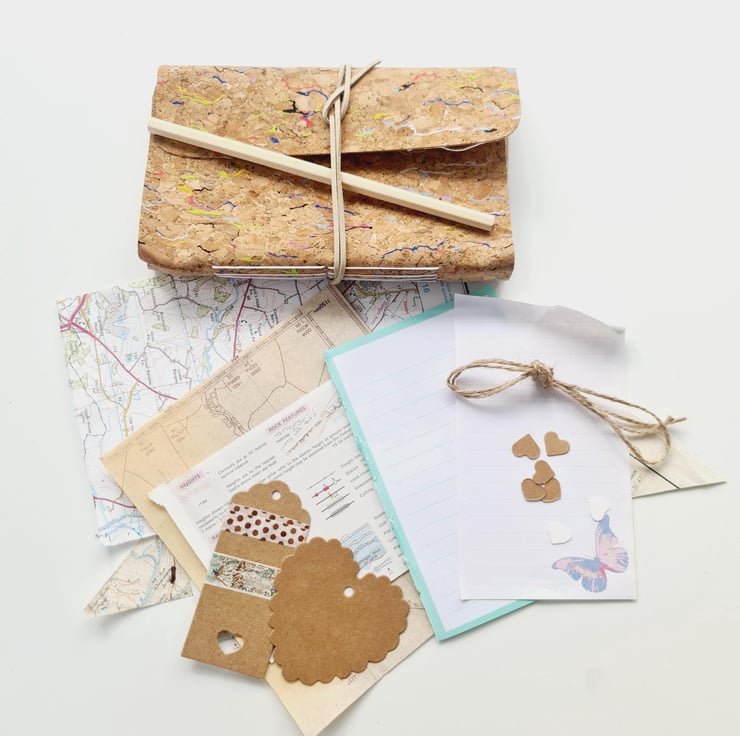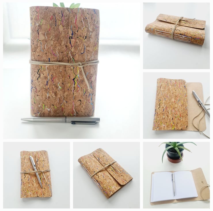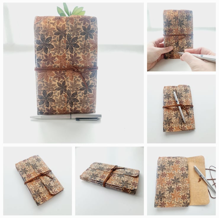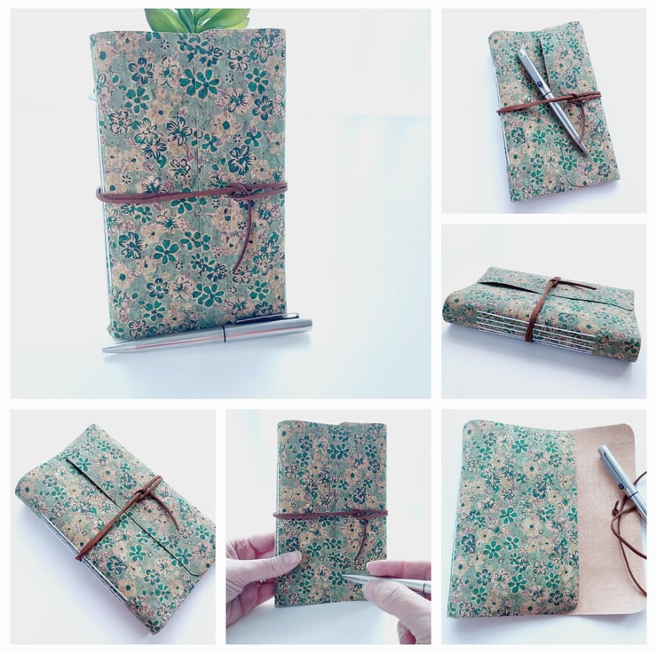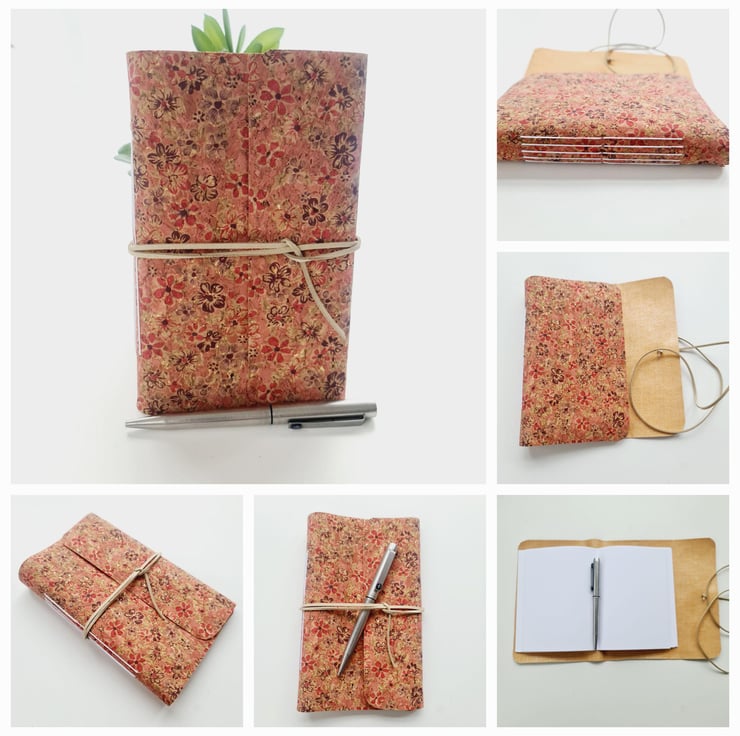 Cork fabric is wonderfully soft to the touch, strong, durable, sustainable & eco-friendly and has a coordinating faux suede wrap tie to keep the notebook closed when not in use.