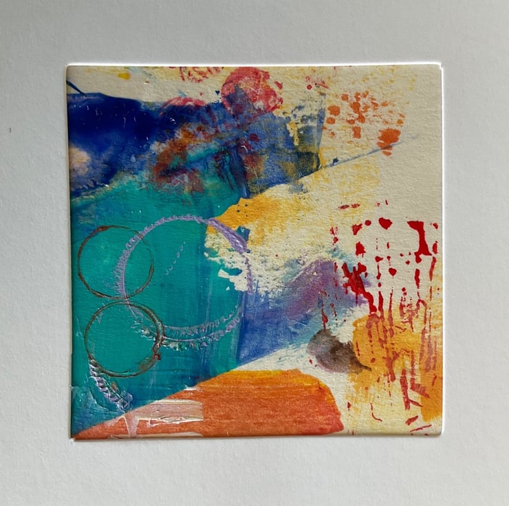 This 6cm square original acrylic painting is mounted into a blank greetings card with envelope, showing a colourful textured abstract image.