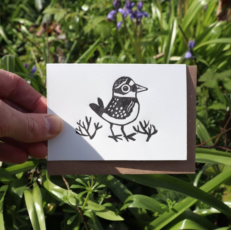 Handprinted Linocut Card featuring a Little Ringed Plover bird - small card