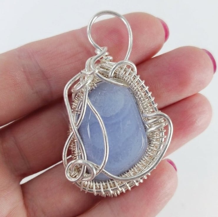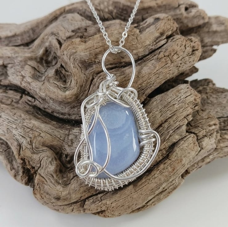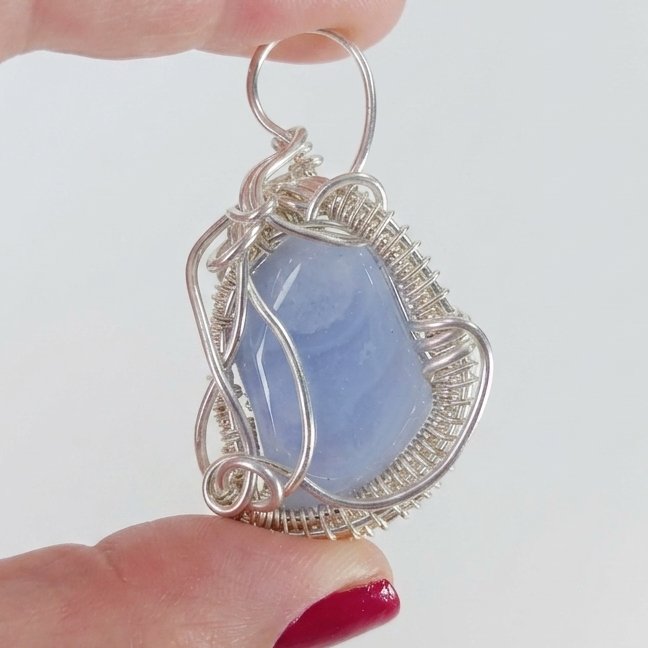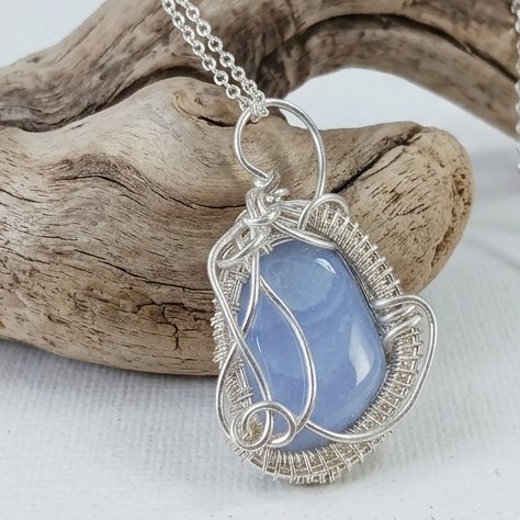 A beautiful piece of blue lace wire wrapped in silver-plated wire. This pendant measures approximately 2.2" in height by 1.1" in width and comes on a 20" trace chain.