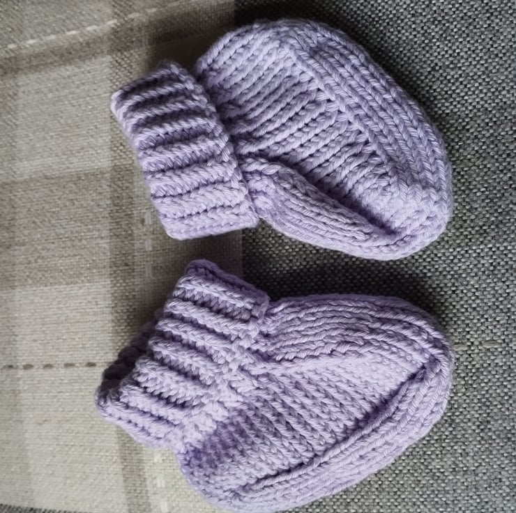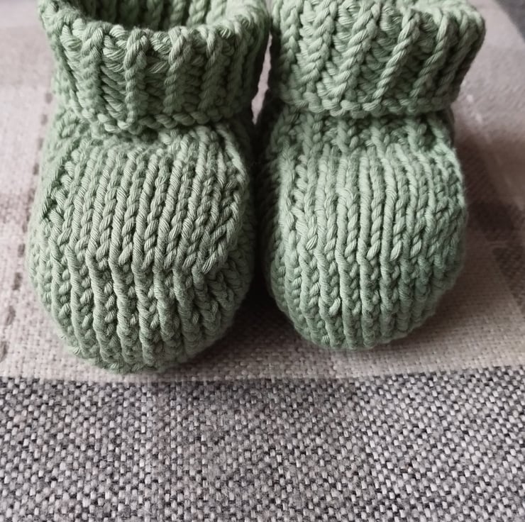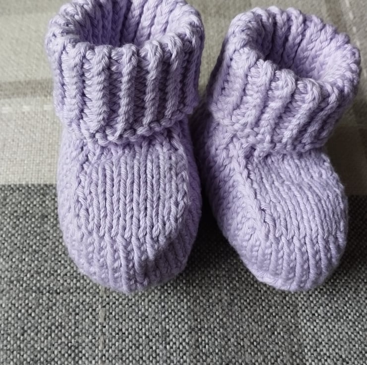 Lemon colour booties up to 6-12 months, lilac colour up to 3-9 months and sage colour up to 0-6 months.
