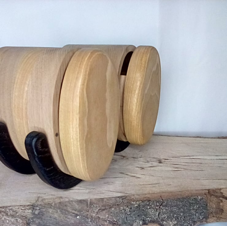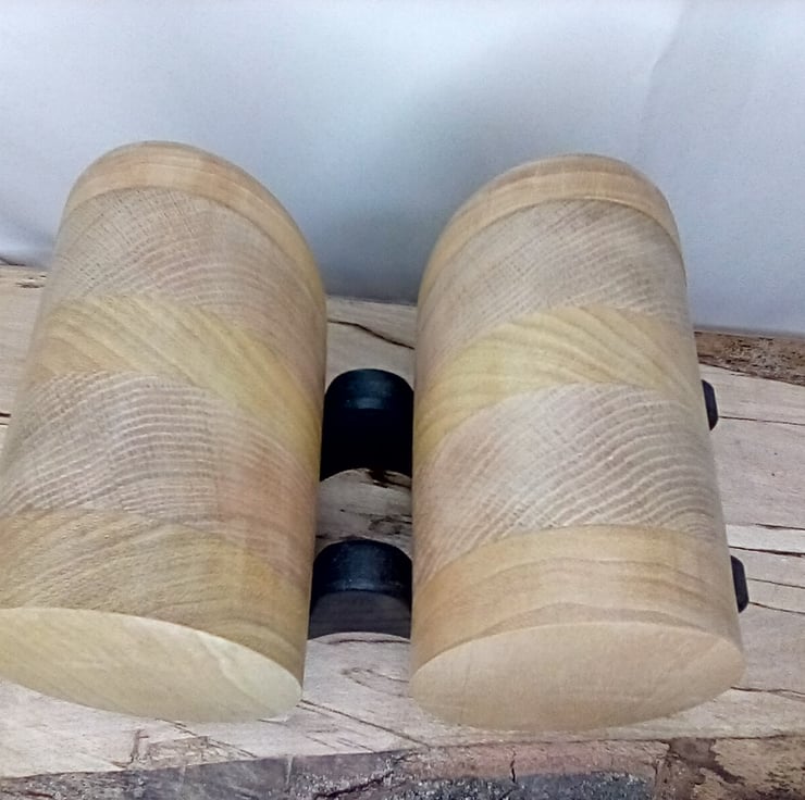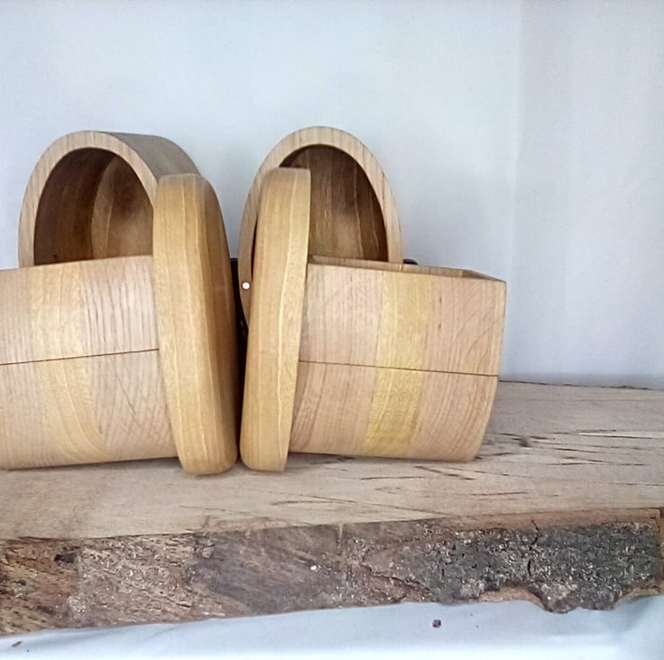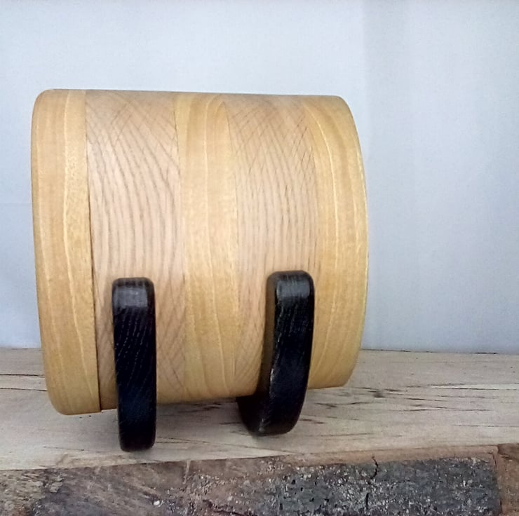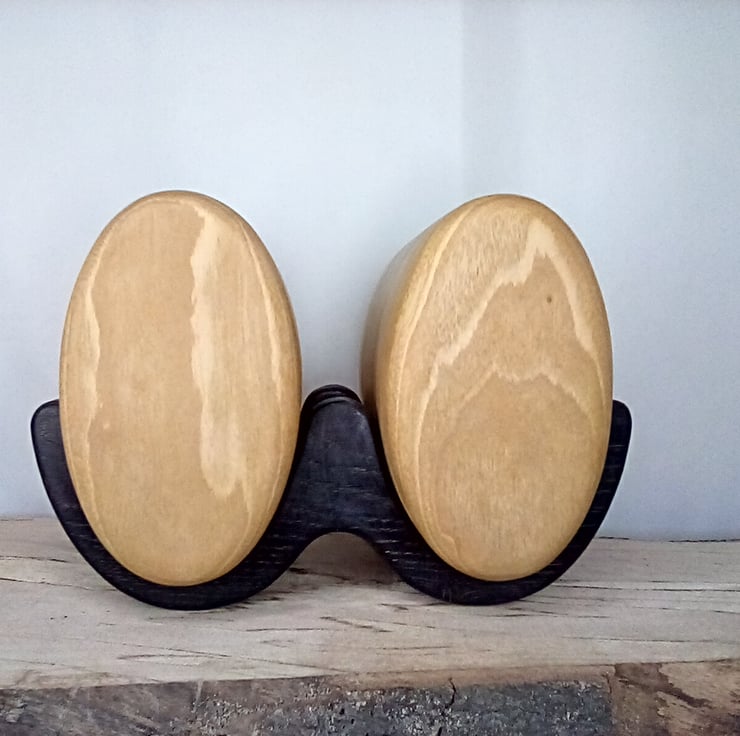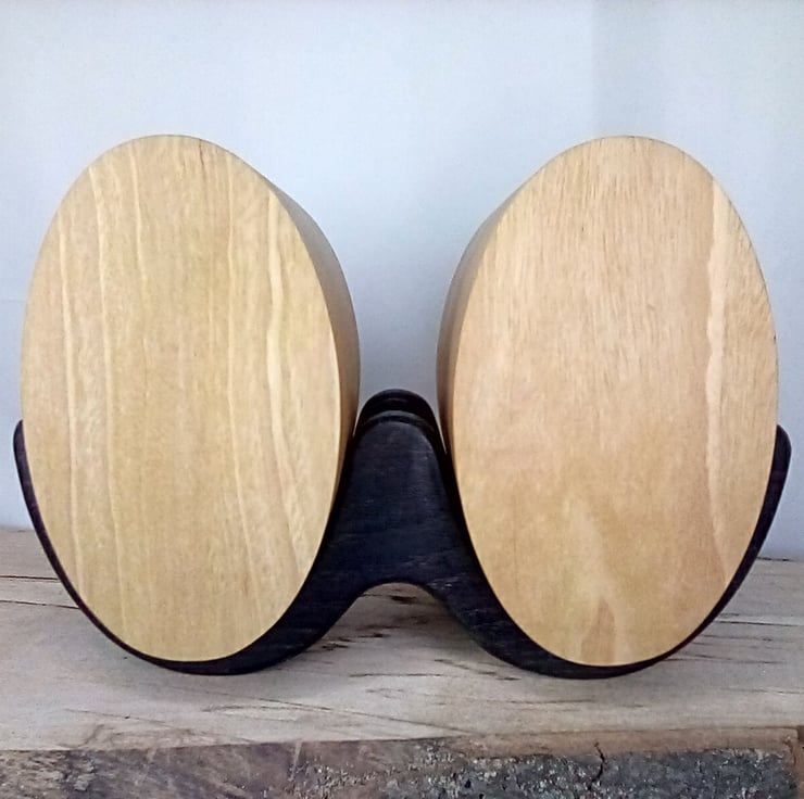 Bespoke hand made oak and emrie eclipse double drawer box with a ebonised curve stand giving it a elegant design and a beautiful display item the two large drawers boast having double layers with a lift out trays for extra storage the emrie fronts and rears give the boxes a flame design adding to its appeal finished in a natural wax to enhance the beauty of the grain . Standing 17cm high 25cm wide and 14.5cm deep