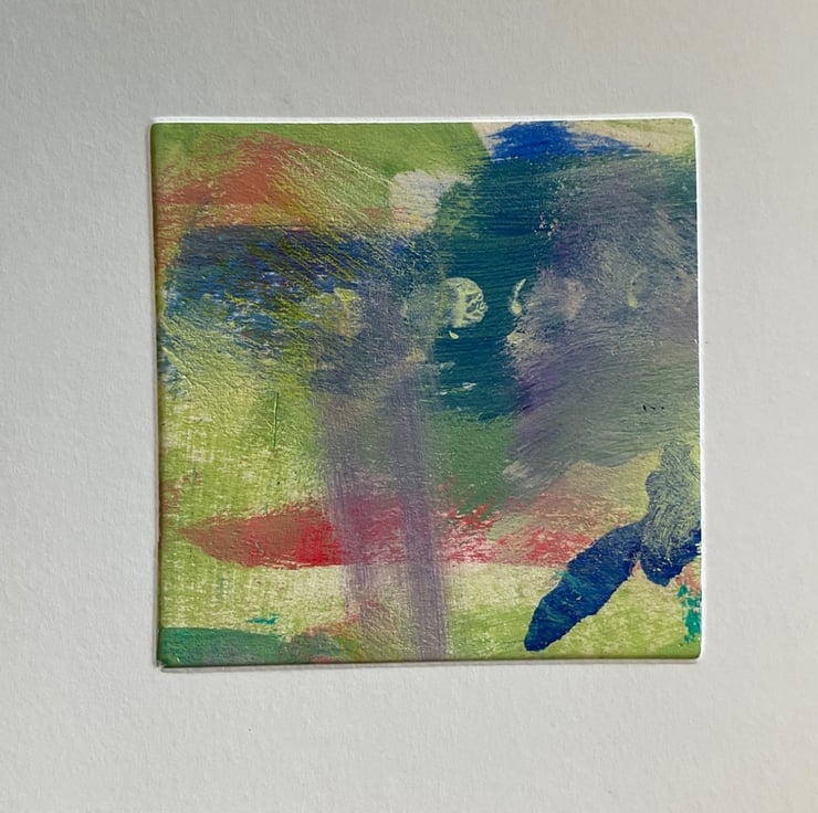 This 6cm square original acrylic painting is mounted into a blank greetings card with envelope, showing a colourful textured abstract image.