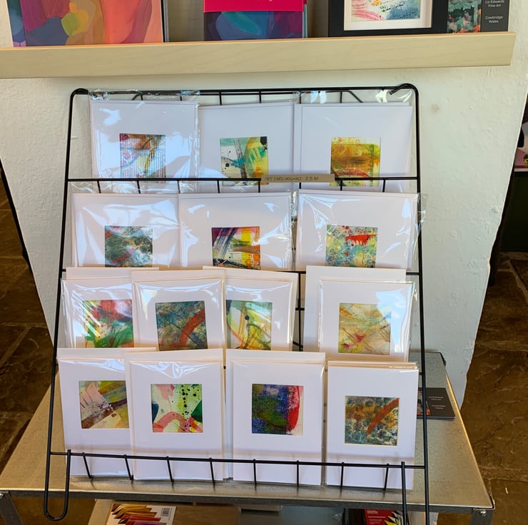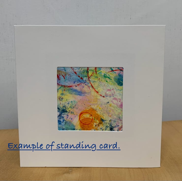 This 6cm square original acrylic painting is mounted into a blank greetings card with envelope, showing a colourful textured abstract image.