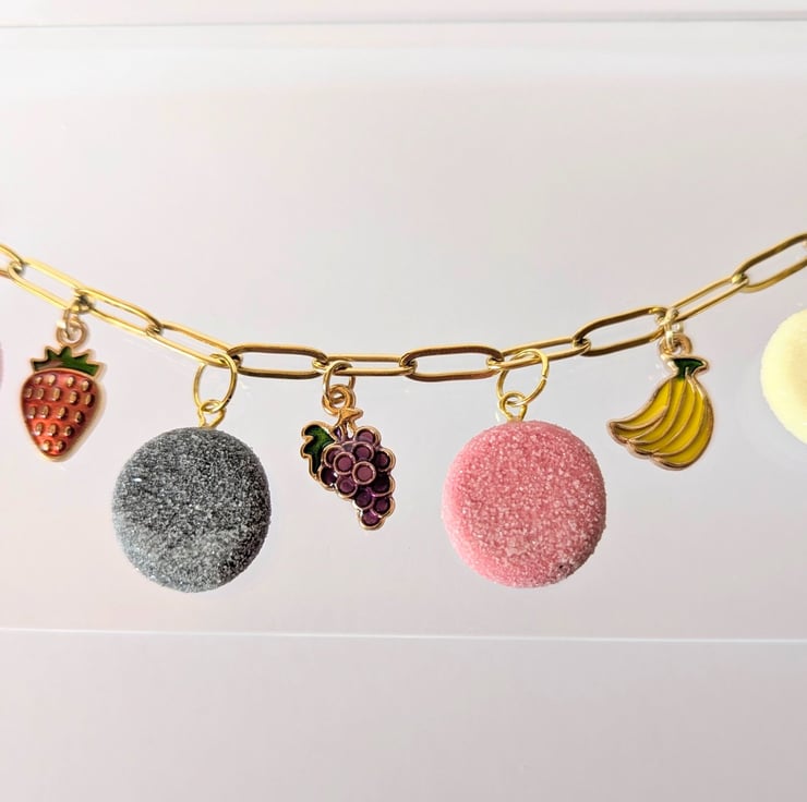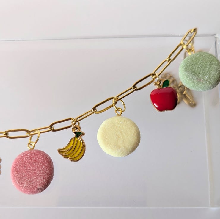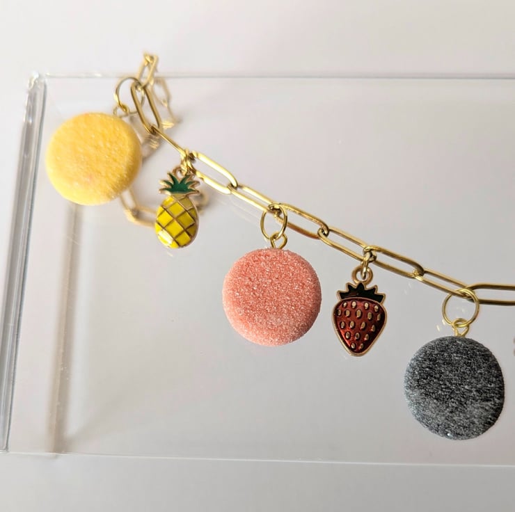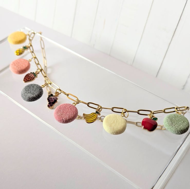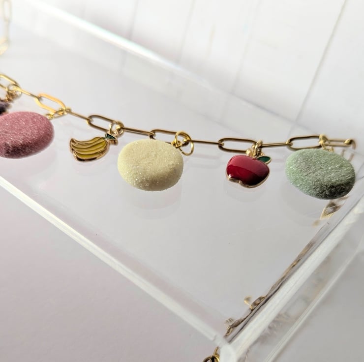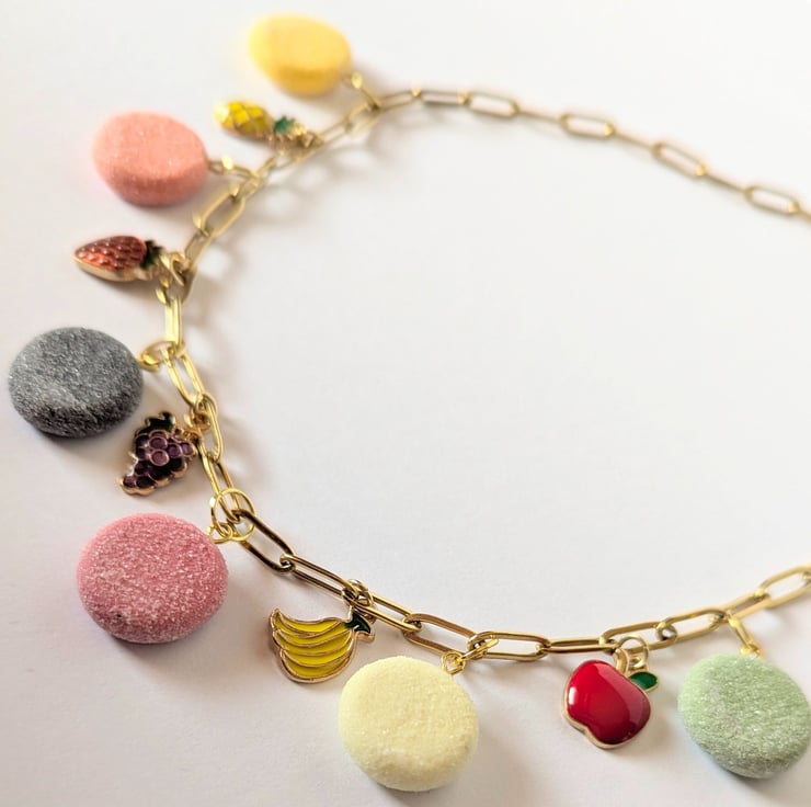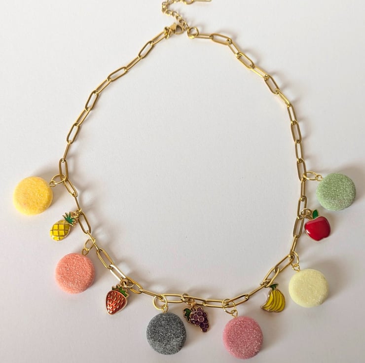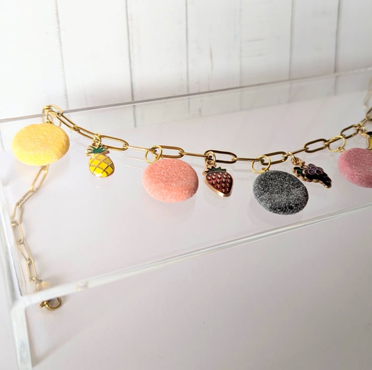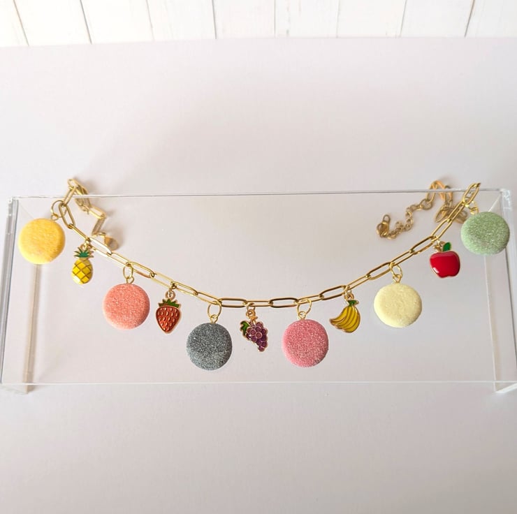 This fruit pastille necklace is so cute! The fruit pastille charms are handmade from polymer clay with a faux sugar finish. The fruit charms are enamelled brass. The stainless steel paperclip chain is 16 inches and has an extender.