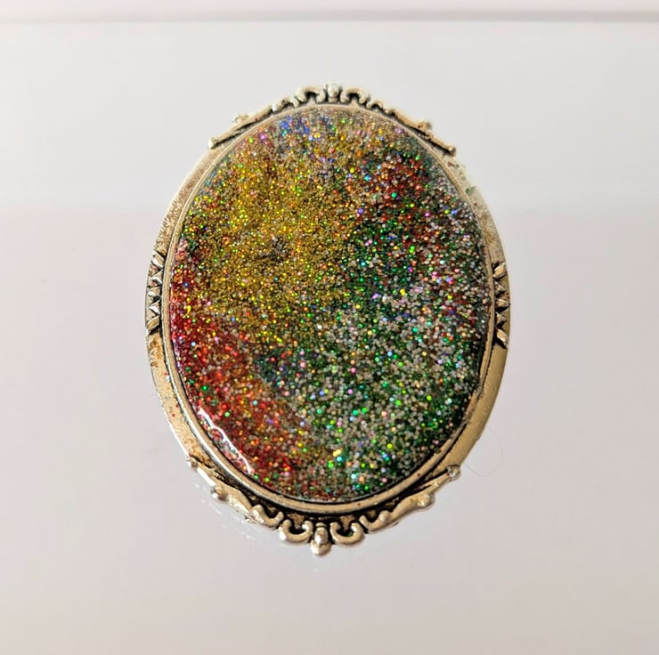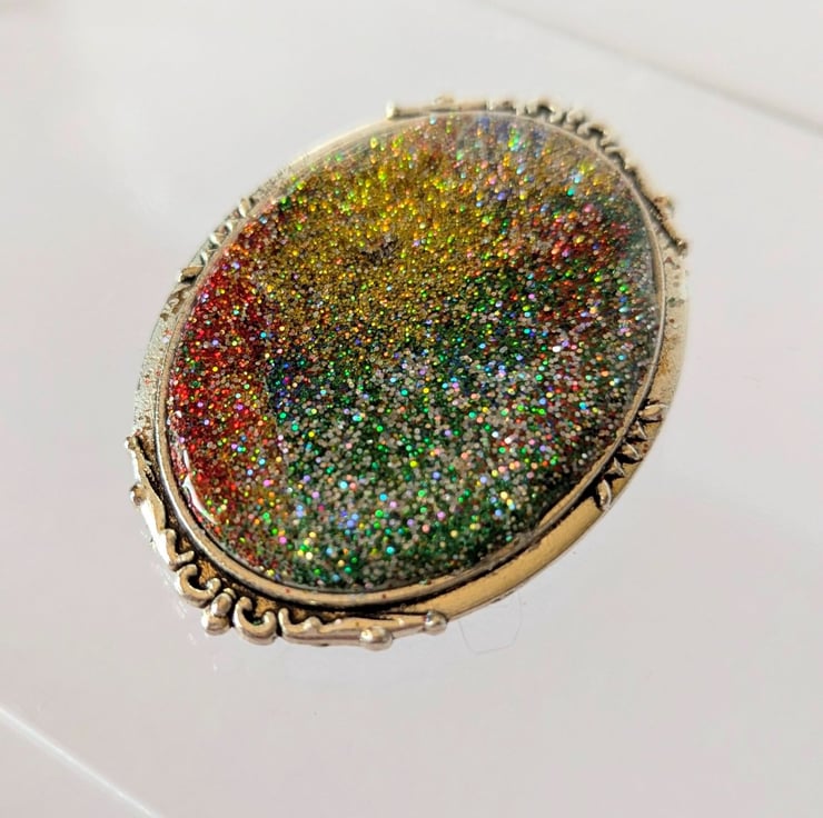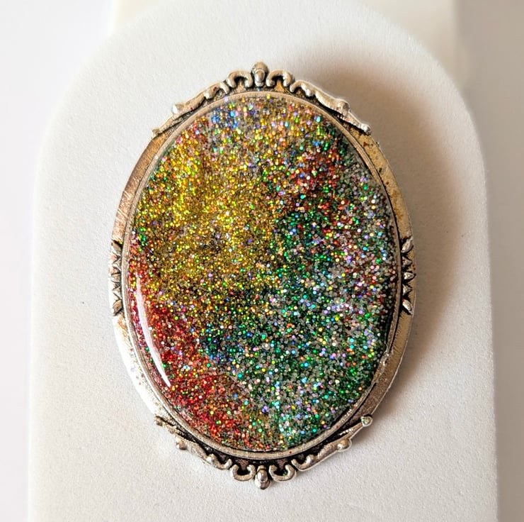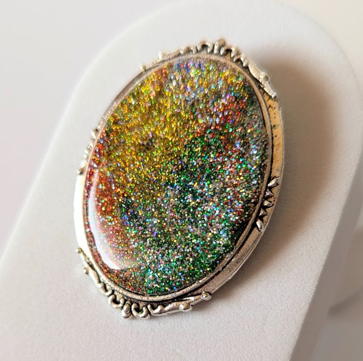 This brooch has a lovely vintage look. The simple surround is alloy and the stone is polymer clay, with the addition of holographic glitters which make it extra sparkly. The pictures don't capture just how much sparkle there is! It is topped with UV resin for a super shiny finish.