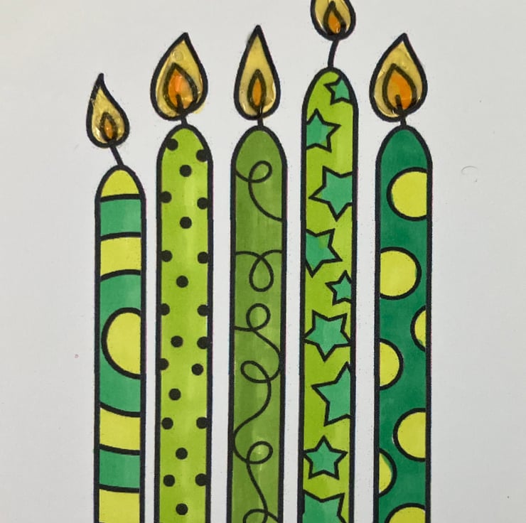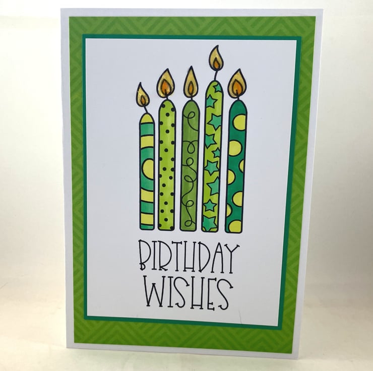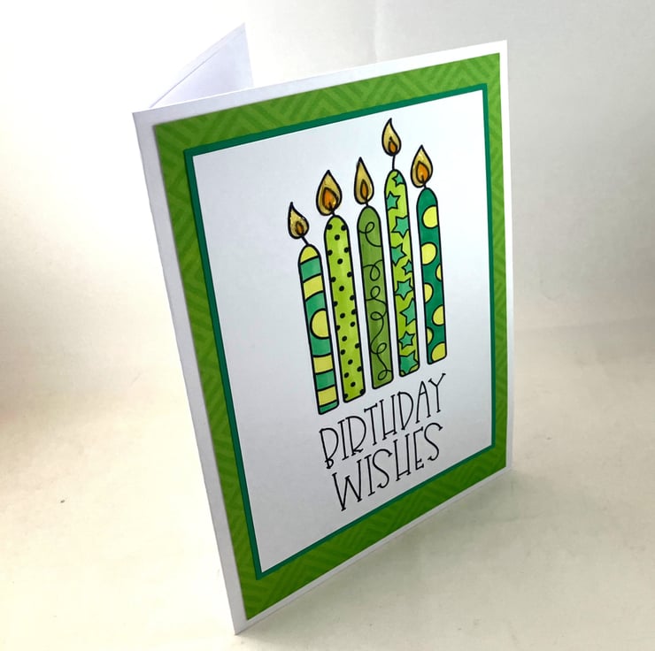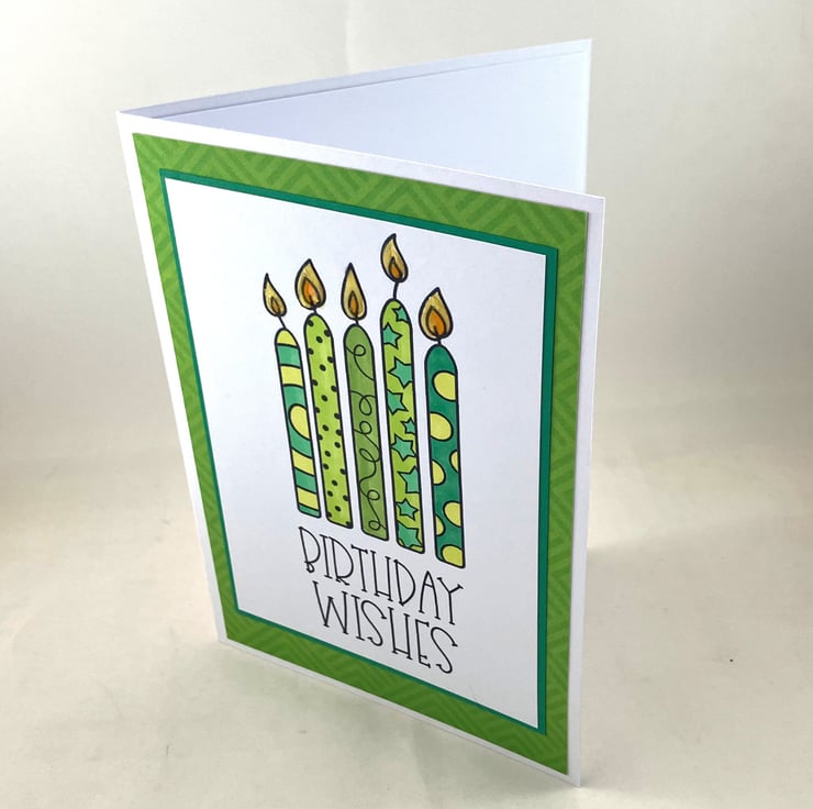 Birthday card featuring 5 patterned birthday candles in various shades of green. The flames have had glossy highlights added for a 3d feel. The image has been mounted onto dark green card, over a lime green patterned background. The printed sentiment reads: 'Birthday Wishes'.