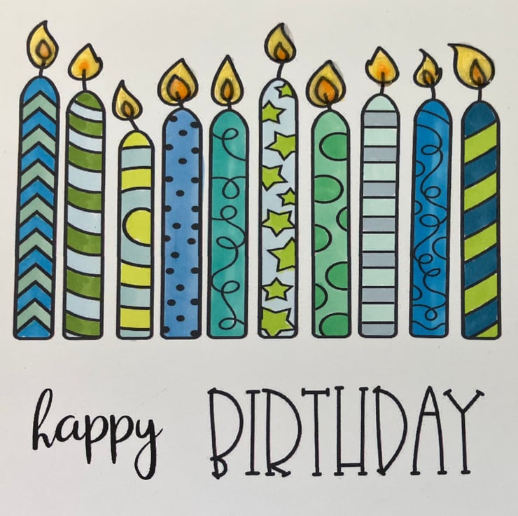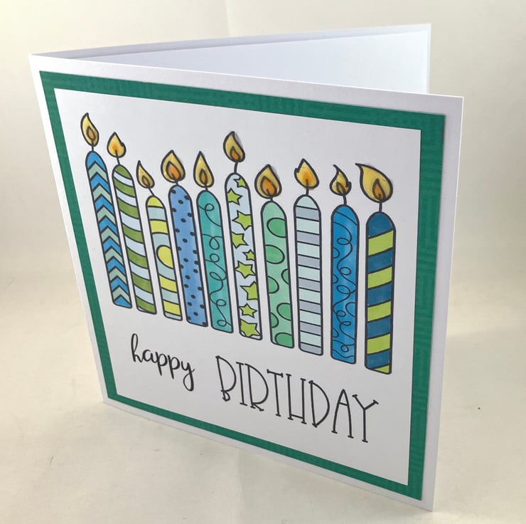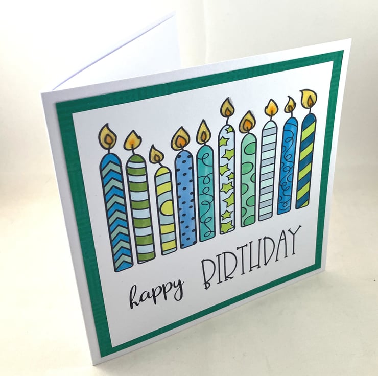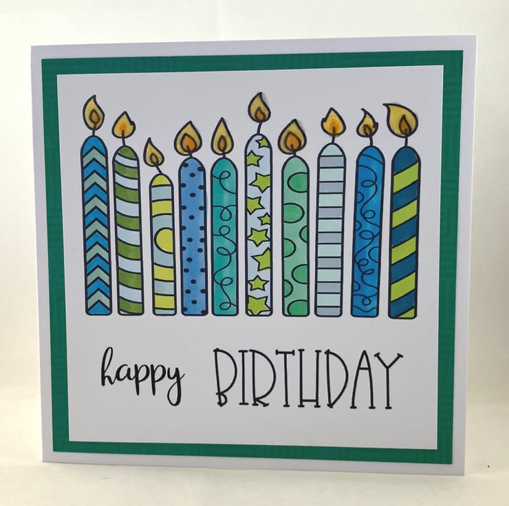 Square birthday card featuring 10 patterned birthday candles, coloured in various shades of blue/green/teal. The flames have had glossy highlights added for a 3d feel. The image has been mounted onto dark green patterned card. The printed sentiment reads: 'Happy Birthday'.