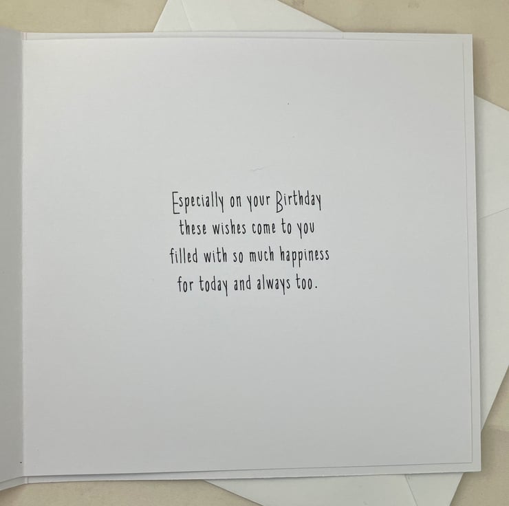 The card measures approximately 15cm (6 inches) square. The card will arrive in a sealed wrapper, together with a white envelope.