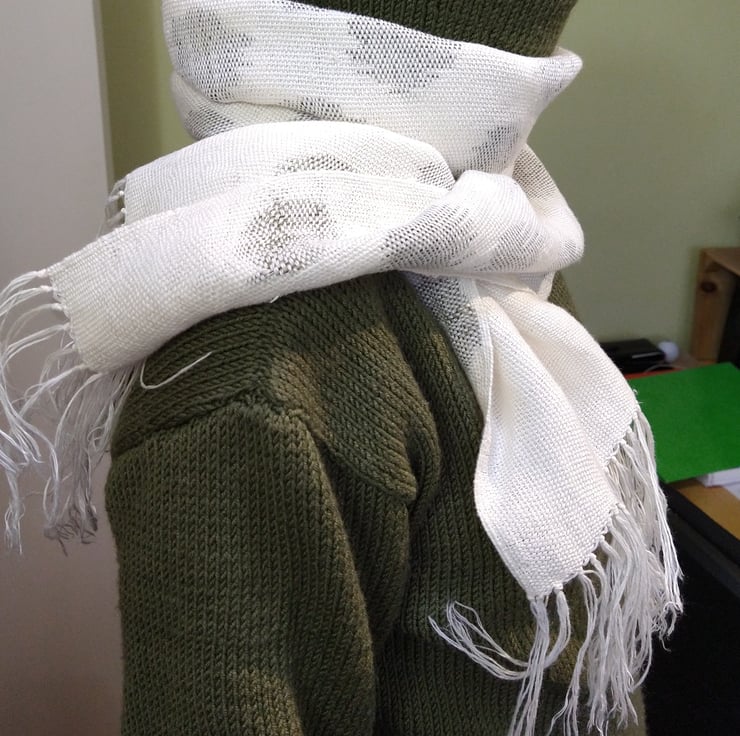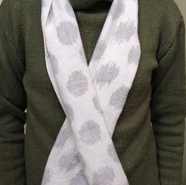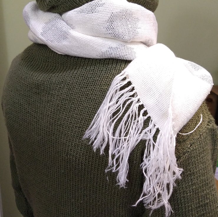 Lovely cream 100% linen handwoven scarf. It has Ikat technique circular shapes in olive green. The warp was handpainted before weaving for the Ikat design. This scarf was made with the individualist in mind who loves and appreciates items that are made by hand and special.