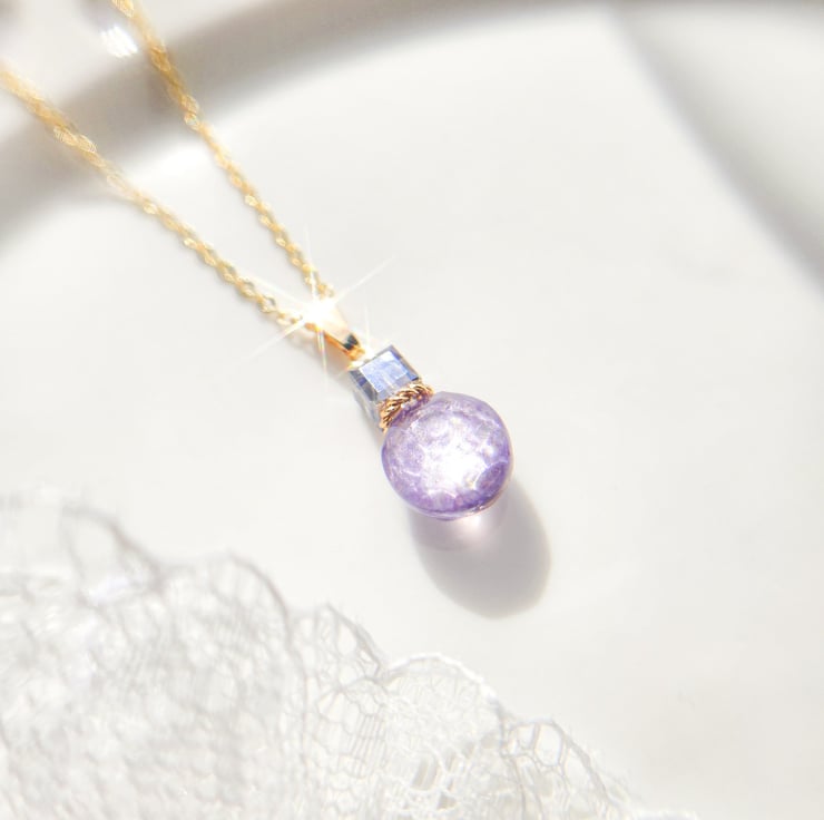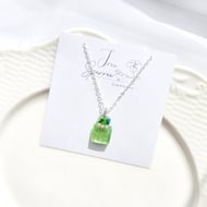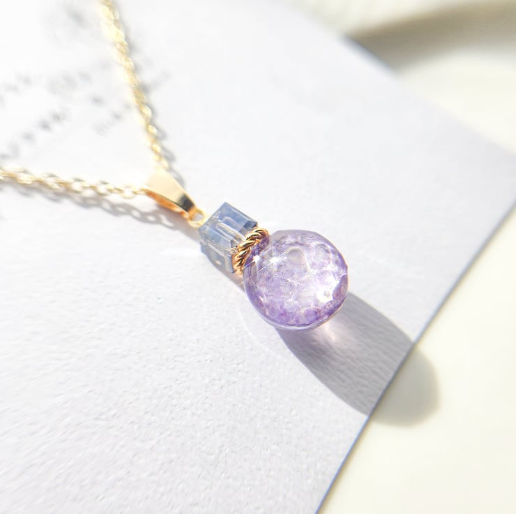 A delicate perfume bottle-inspired necklace, softly coloured using a watercolour technique and sealed within clear resin.