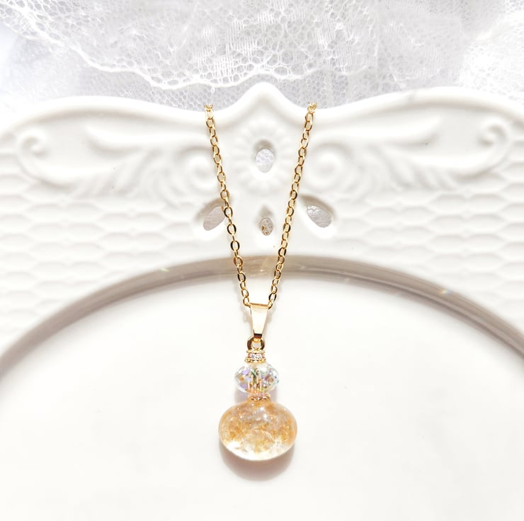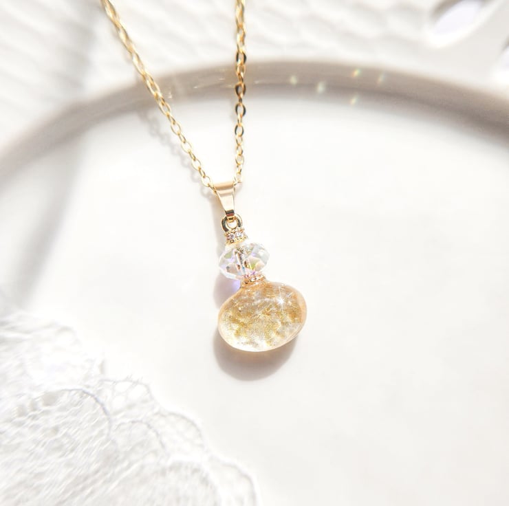 A delicate perfume bottle-inspired necklace, softly coloured using a watercolour technique and sealed within clear resin.